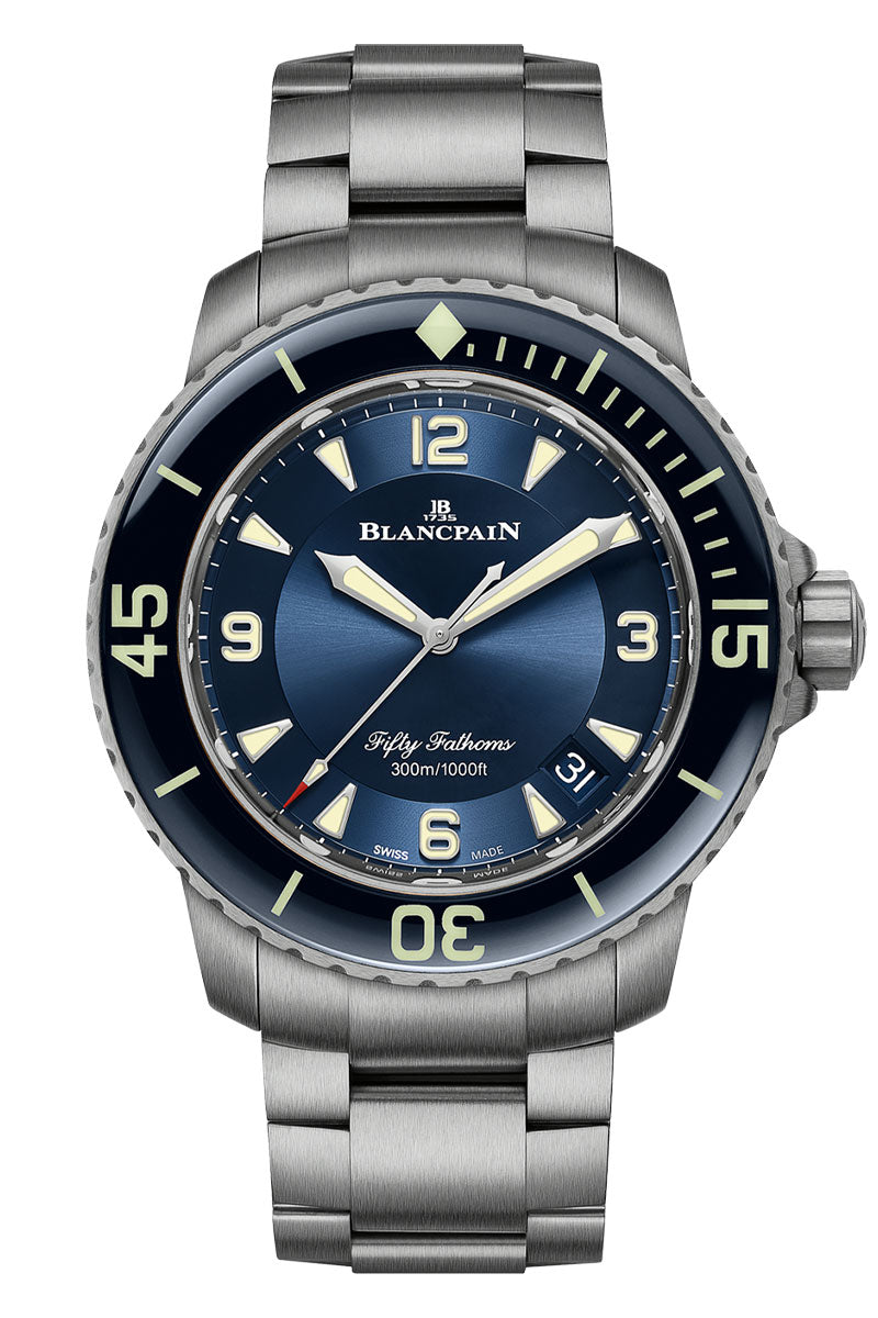 Since its creation of the first modern diver's watch more than 65 years ago, Blancpain has continued to innovate by combining state-of-the-art materials and watchmaking techniques. The latest addition to the Fifty Fathoms collection is a trio of references – including this one – which are now available on a satin-brushed titanium bracelet, maintaining the iconic diver's sporty yet chic allure while being characterized by their outstanding performance and lightness.
