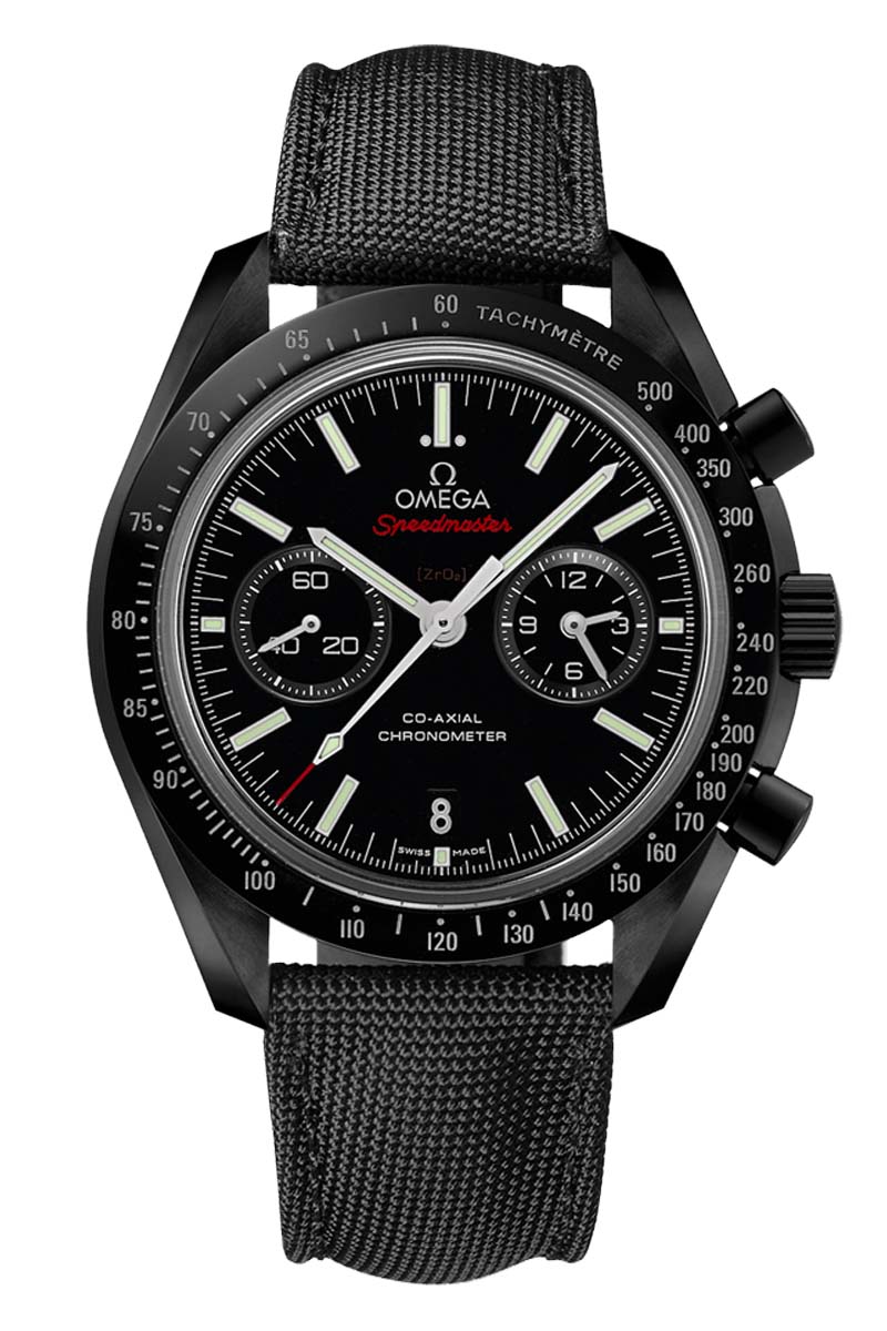 Driven by OMEGA's Co-Axial Calibre 9300, this bold timepiece is finished with a black nylon strap that includes a new ceramic and titanium foldover clasp. The hands are diamond-polished 18K white gold, except for the central seconds hand which is polished, rhodium plated with a red tip.