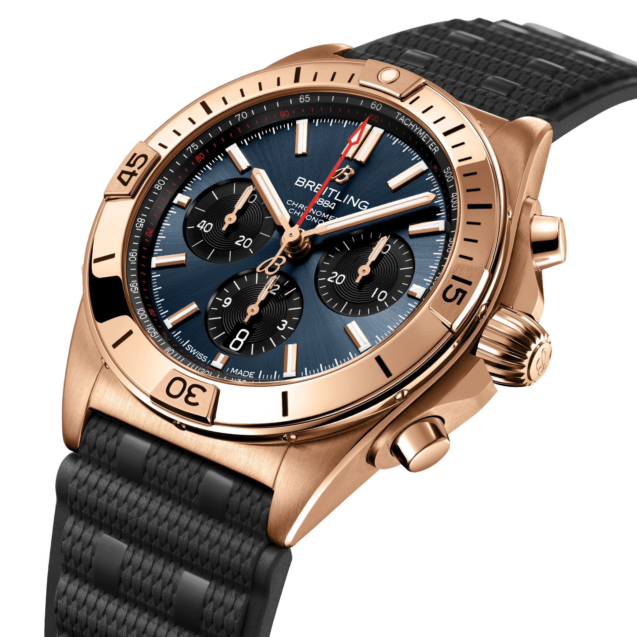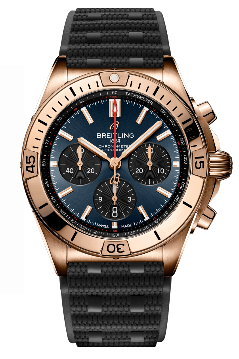 The Chronomat holds a significant place in Breitling’s history. Introduced in 1984, at a time where extra-thin quartz timepieces were the order of the day, Breitling placed a bold bet on an impressively proportioned mechanical watch. Based on the Frecce Tricolori chronograph, which had been developed and launched in 1983 in collaboration with the famed Italian aerial squadron, the Chronomat celebrated Breitling’s centenary in style and marked the return of the mechanical chronograph to its rightfully prominent place at the brand which had built its global reputation on these incredible watches. The Chronomat features a 42 mm case and the iconic bezel with the four rider tabs. Here in 18k red gold with a commemorative blue dial for Super Bowl LVIII, the Chronomat is matched to a black rubber strap and is powered by the in-house Breitling Manufacture Caliber 01, a column wheel-actuated COSC-certified chronometer, which retains 70 hours of power reserve.