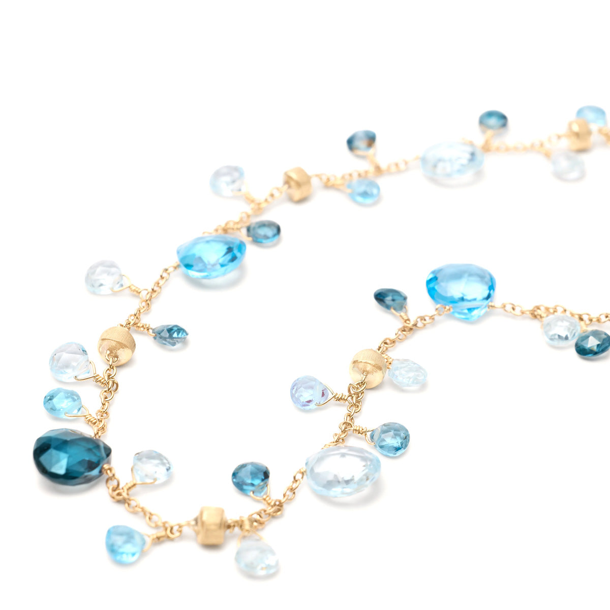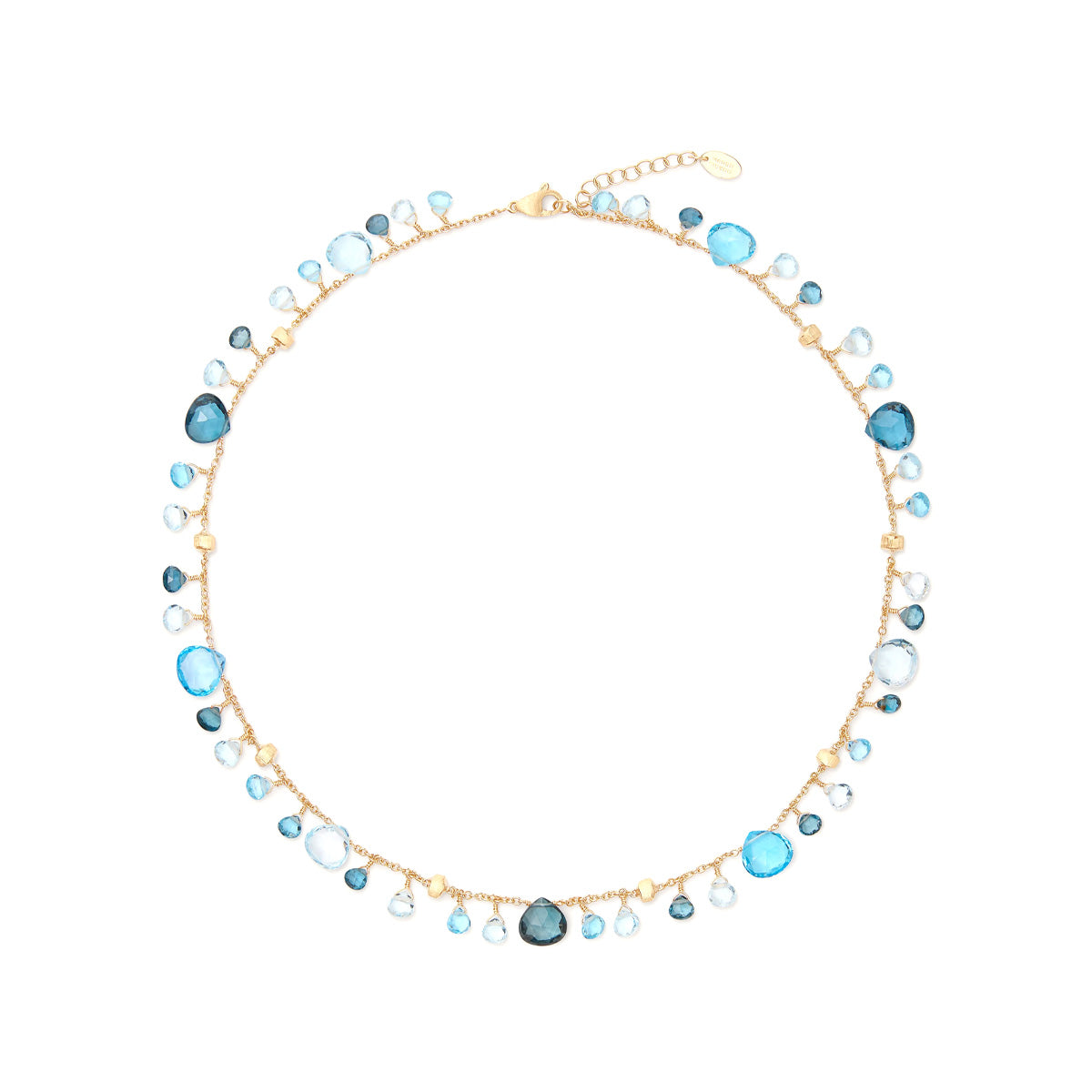 Characterized by infinite shades of blue, this necklace features a sequence of natural heart-cut topazes interspersed by precious 18K yellow gold nuggets, finely hand-engraved using an ancient Florentine technique.