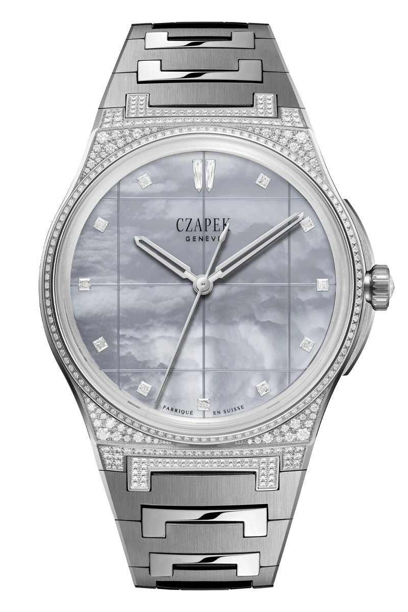 La ‘Carte des Nuages’ (literally, the Map of the Clouds) dial plays with the rich glow of mother-of-pearl, offsetting it with a glittering pair of ‘Antarctique cut’ diamonds marking 12, and a Princess cut diamond set at each of the 11 other hours. This ‘Antarctique cut’ of the elongated index markers is an entirely new diamond cut, designed for Czapek by Adrian Buchmann of London-based studio Fuzion Ltd, and registered as a proprietary Czapek cut. Etched into the surface, six fine guilloché gridlines anchor the composition, in a playfully modern take on the traditional craft of guillochage – with a subtle allusion to cartography. Taken from the central and most lustrous part of the oyster shell, the wafer-thin discs of mother-of-pearl used for these dials are rarely guilloché due to their fragility; to do so requires a highly specialised skill that only a few Maisons are able to source.