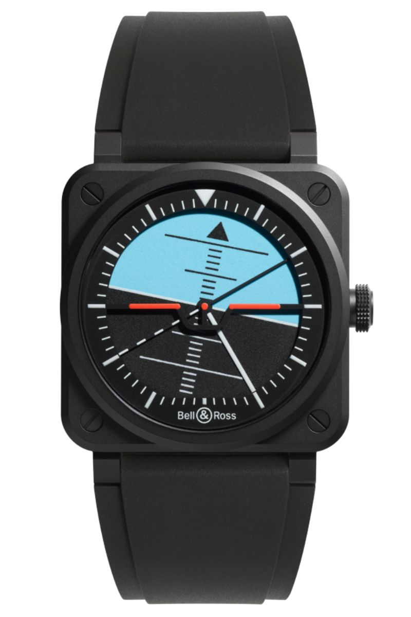 Bell & Ross, the instrument watch specialist, takes inspiration from aircraft cockpits with the BR-03 Horizon, which evokes the iconic dial of the gyroscopes used for handling flights with zero visibility.