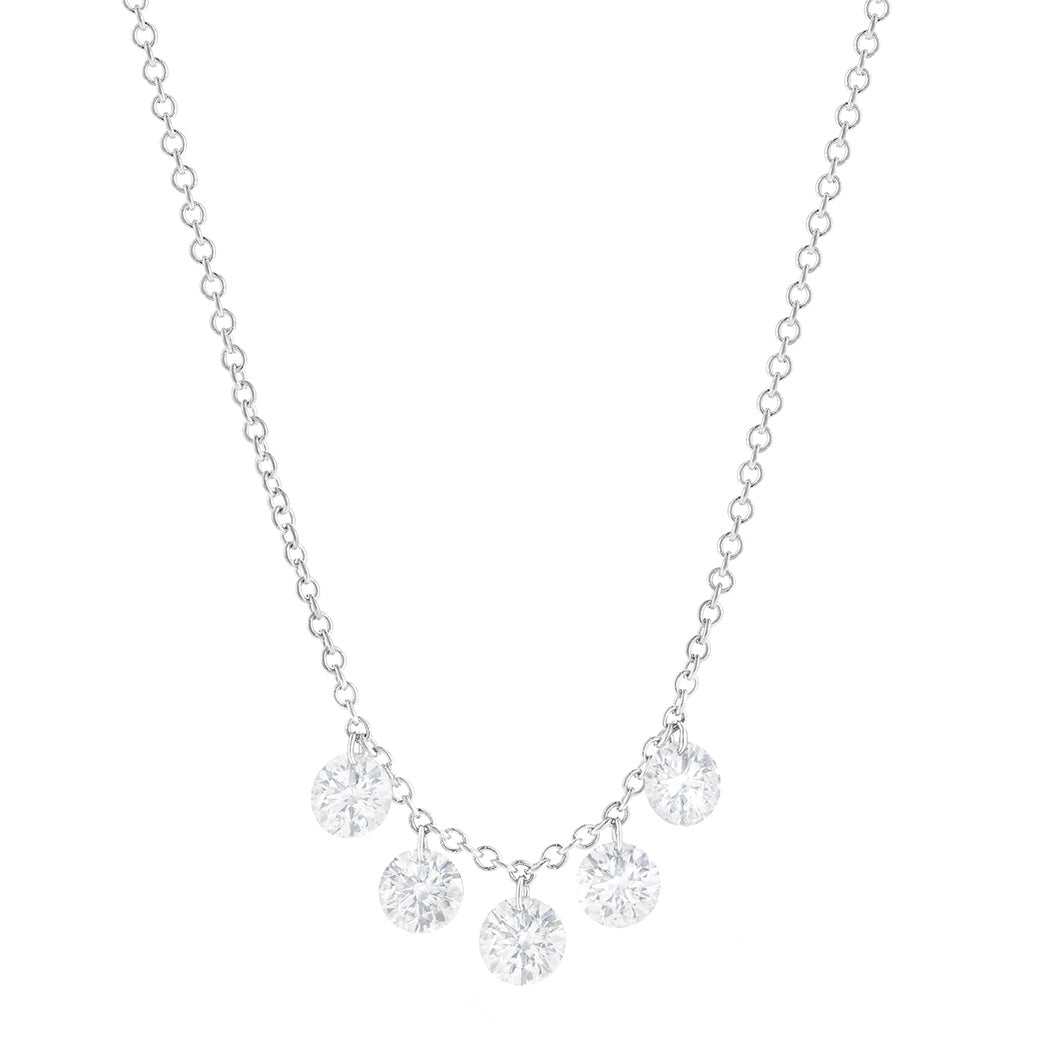 5 stone round diamond fringe necklace. Our signature floating diamonds in a stunning quintet.