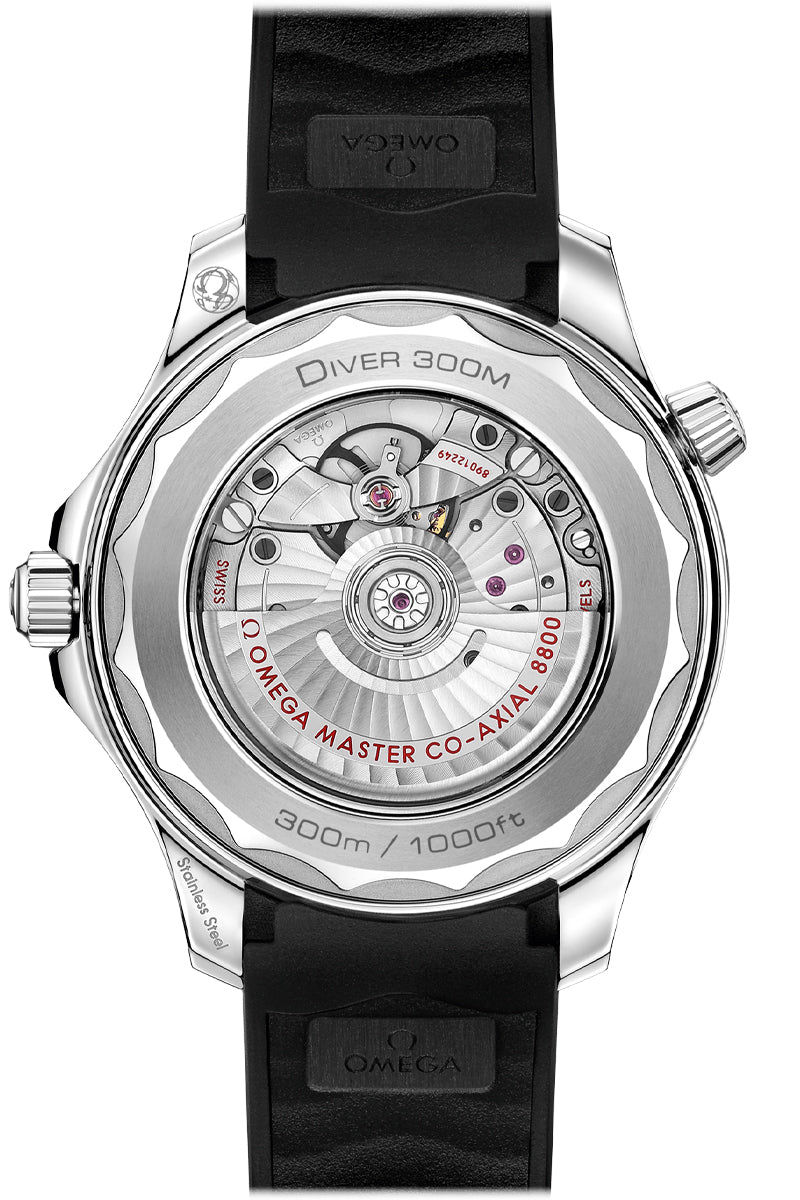 The watch is presented on an intergrated black rubber strap and is driven by the OMEGA Master Chronometer Calibre 8800, which can be seen through the sapphire-crystal on the wave-edged caseback.