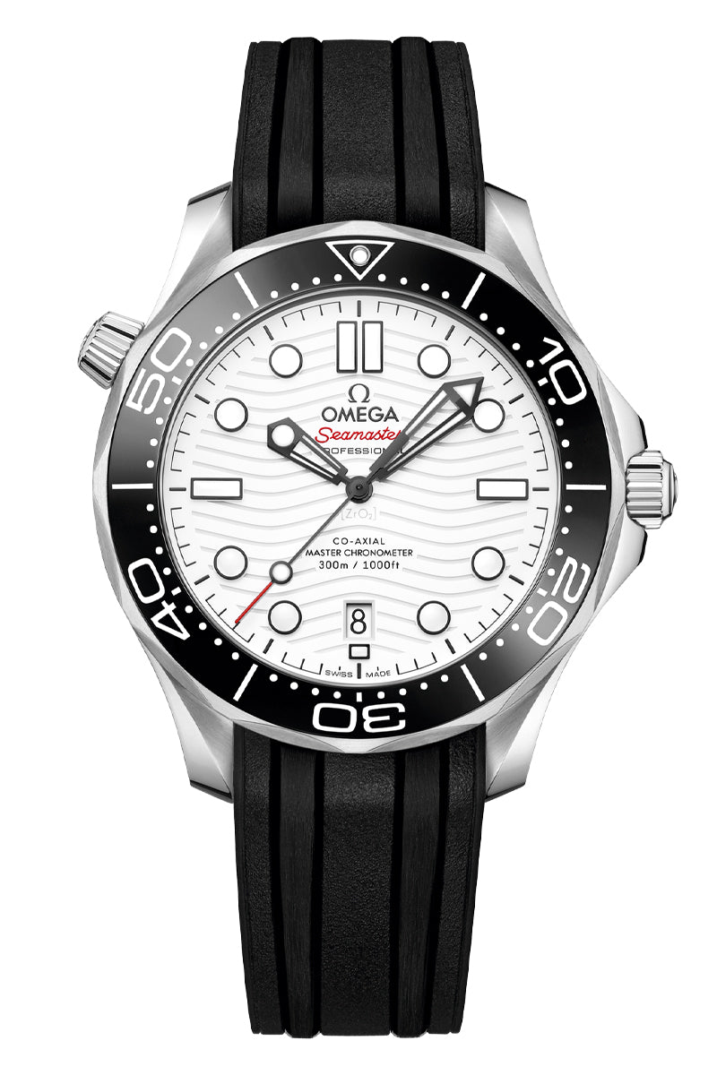This 42 mm model is crafted from stainless steel and includes a black ceramic bezel with a white enamel diving scale. The dial is polished white ceramic and features laser-engraved waves and Seamaster highlighted in red.