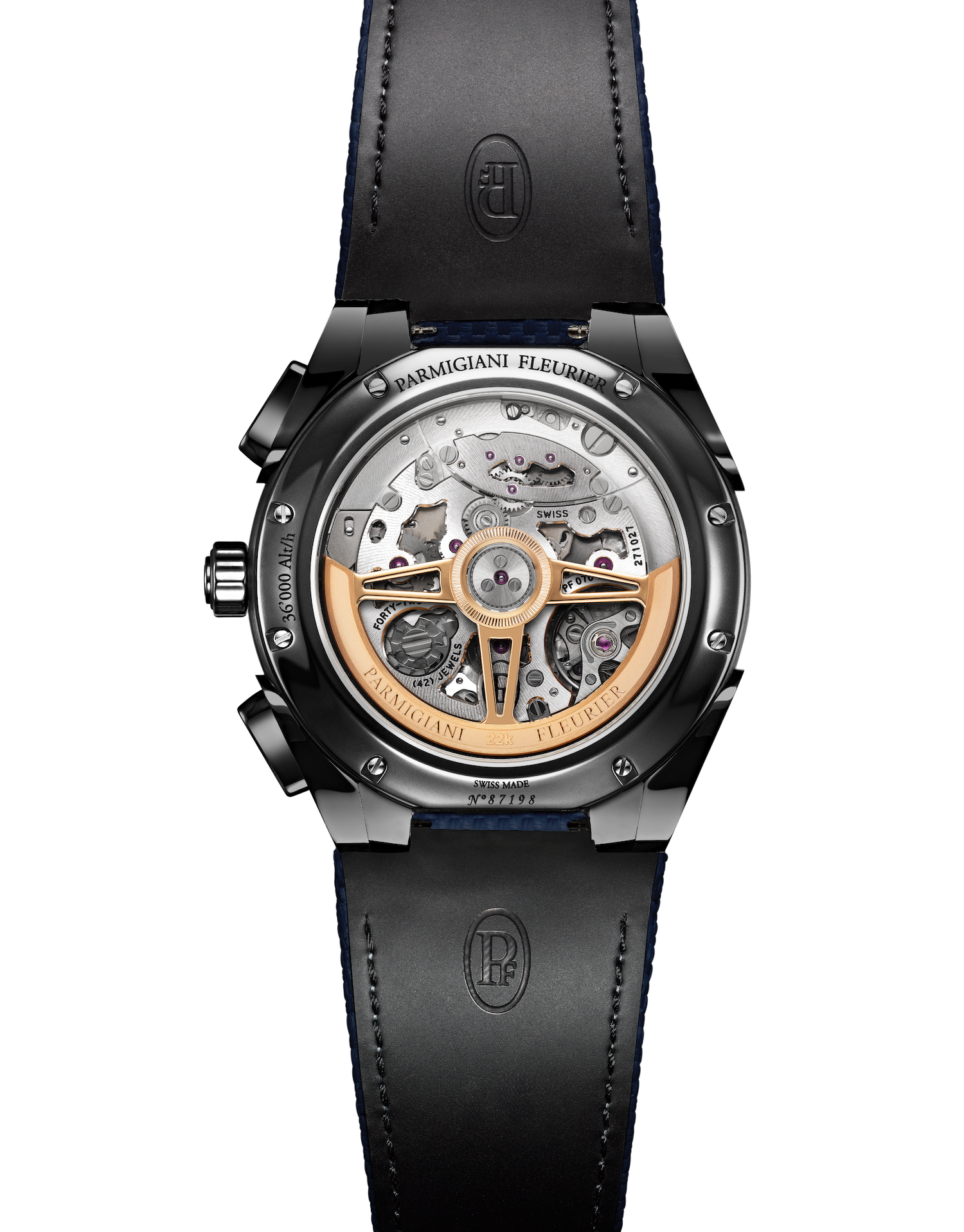 This spectacular chronograph is powered by Parmigiani's own COSC-certified PF070 caliber, an automatic manufacture movement. With a column wheel and high-beat frequency of 36,000Vph (5 Hz), it combines stunning accuracy with 65 hours of power reserve. The 22-carat rose gold skeletonized oscillating weight and satin-finished open-worked bridges with hand-beveled edges add a touch of sophistication.