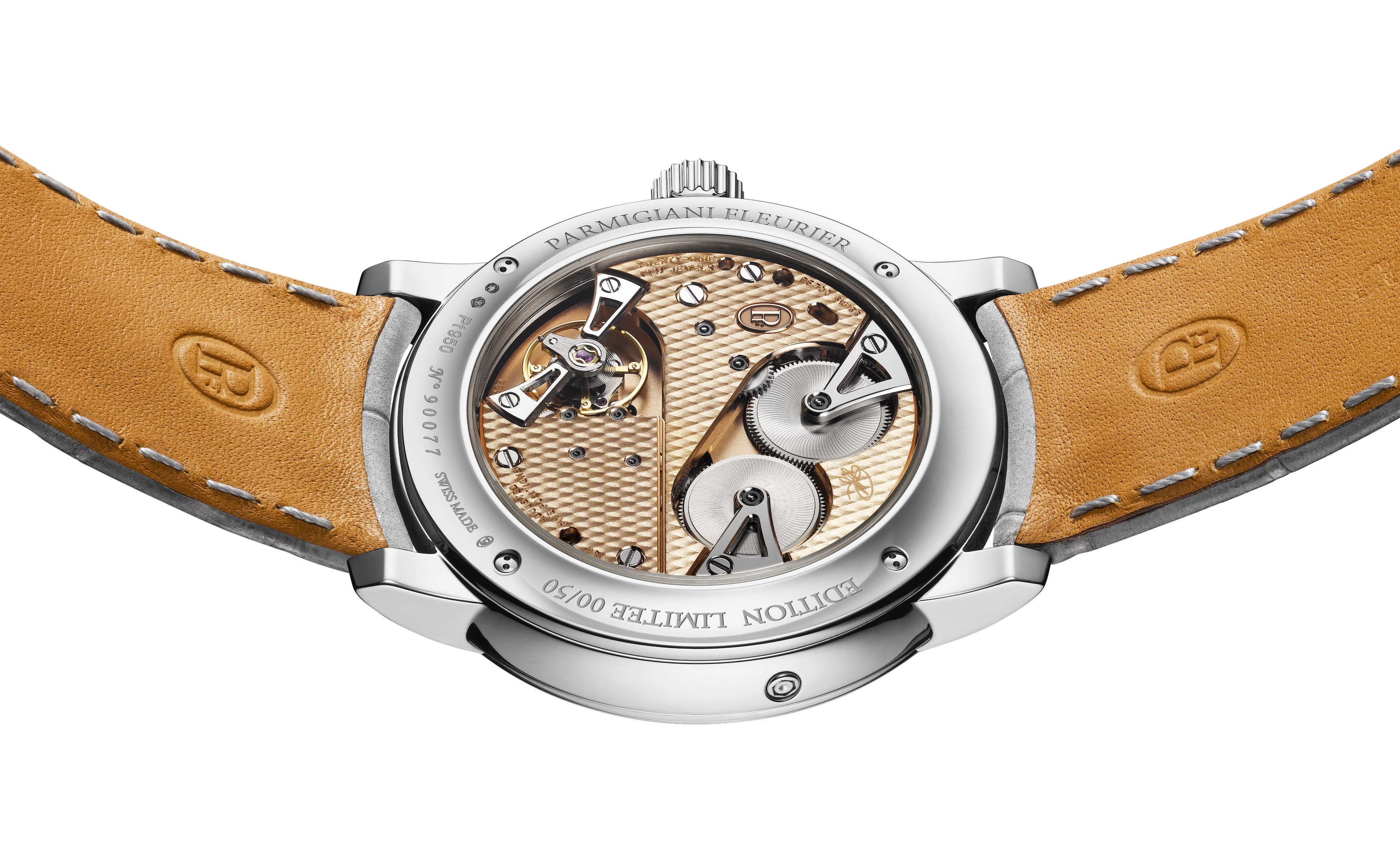 Turn the watch over, where a sapphire caseback reveals the beauty of Parmigiani Fleurier's manufacture masterpiece: the Calibre PF733 perpetual calendar. Here, large 18-carat rose gold surfaces serve as bridges, arranged in a pure geometric perspective and decorated with the distinctive Côtes de Fleurier decorative finish, offering a delicate visual contrast with the sandblasted mainplate. Only the two barrels and the regulating organ are visible. This innovative development, featuring a novel architecture, embraces the great watchmaking tradition while presenting a minimalist and contemporary aesthetic. Its striking graphic construction serves as a key style element, contributing to the overall watch design.