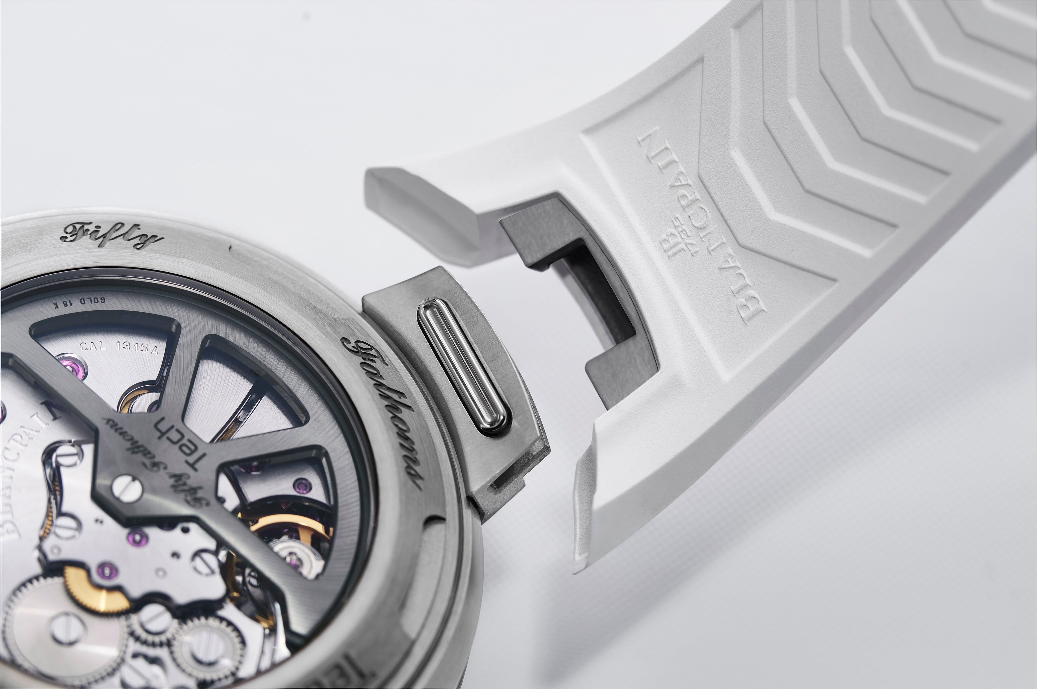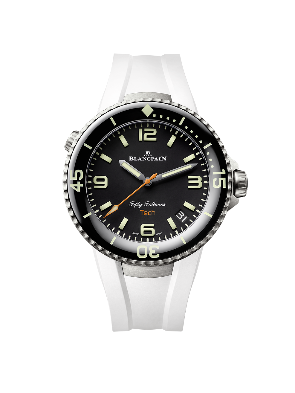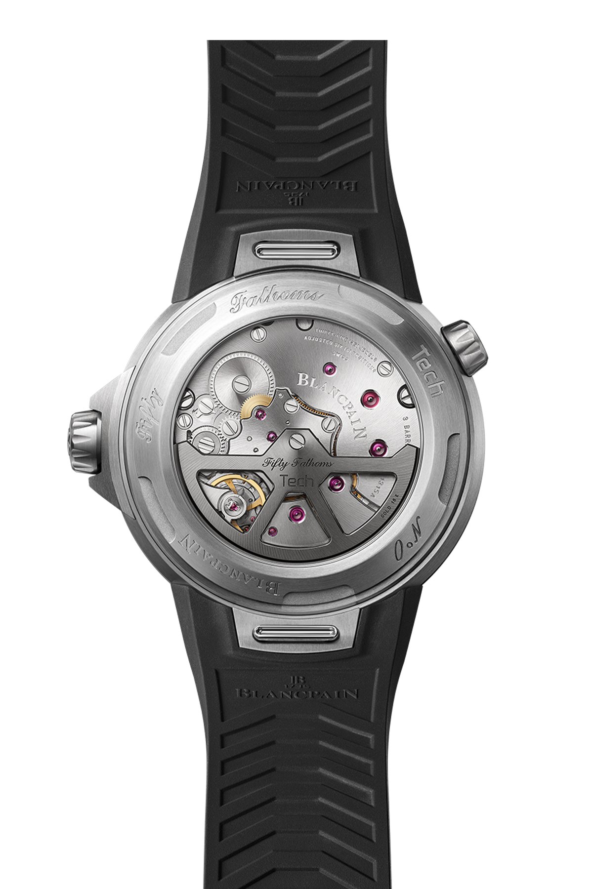 On its reverse, the Tech Gombessa is finished with an exhibition caseback, and an anthracite-grey oscillating weight featuring large cutouts for admiring the movement, which meets the same reliability and strength criteria that have made the Fifty Fathoms the ultimate diver's watch for the past 70 years.