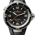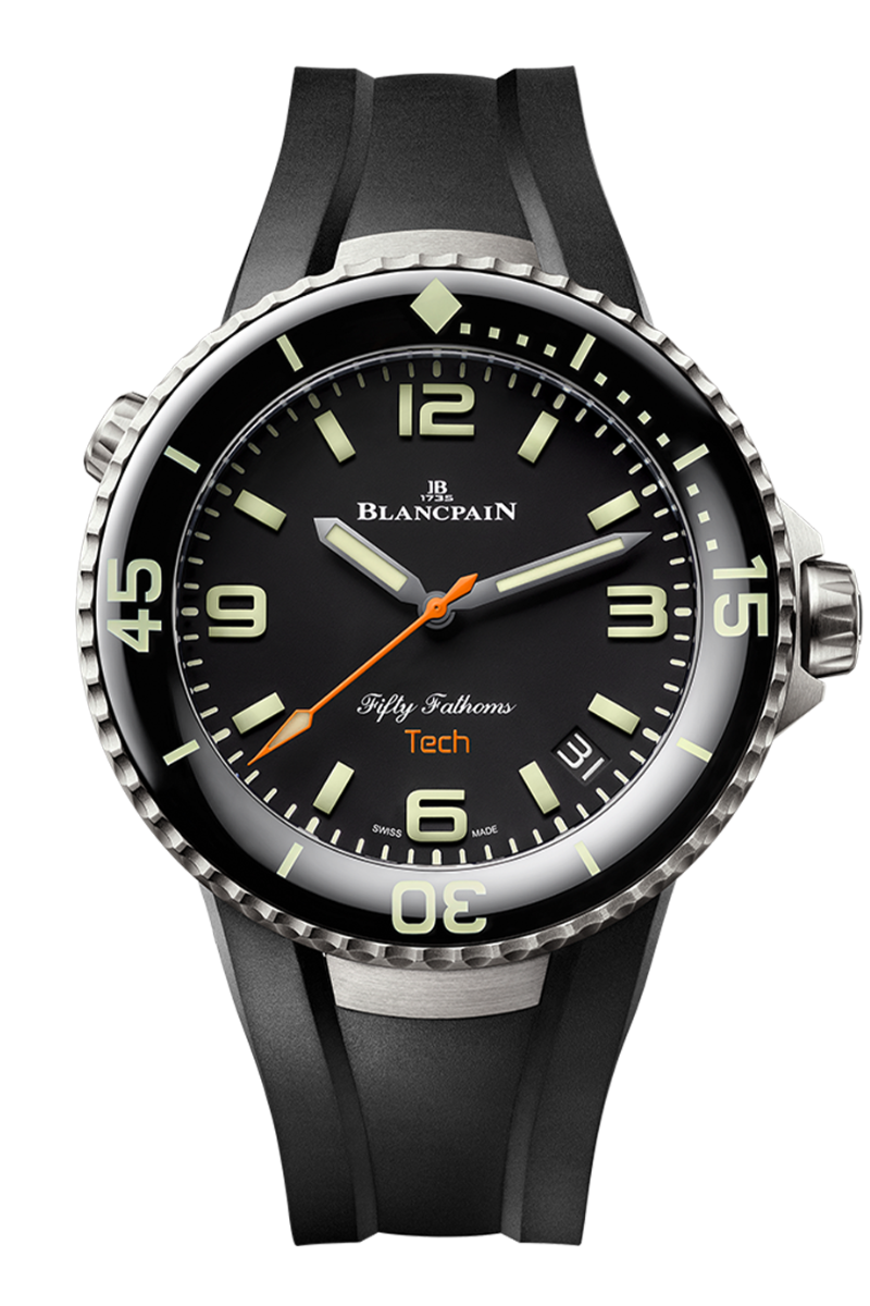 In keeping with the traditions of the highly legible Fifty Fathoms, the dial of the Tech Gombessa retains optimum legibility in the dark, with a special 'absolute black' finish that captures almost 97% of available light. Its applied hour markers are designed as large luminescent blocks to further enhance readability.