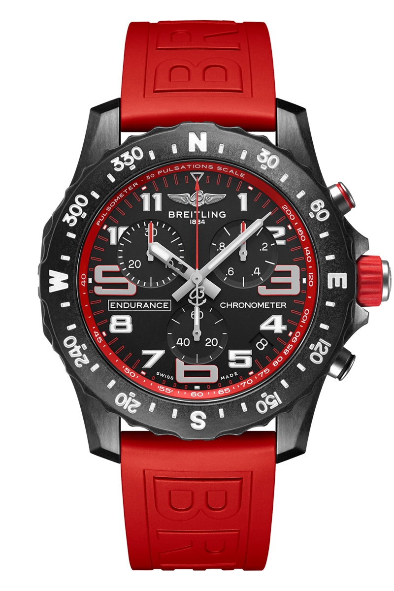 Designed to be both a lightweight watch for athletes and a casual, everyday sports chronograph, the Endurance Pro perfectly blends high precision & innovative technology with a vibrant & colorful design. It is the ultimate athleisure watch. Designed for men and women whose active lives blend a professional mindset with a sporty lifestyle, the Endurance Pro is equal to the challenges of a rigorous workout but fashionable enough for everyday wear. The Endurance Pro features an ultra-light Breitlight® case, a robust material 3.3 times lighter than titanium and 5.8 times lighter than stainless steel. Non-magnetic, thermally stable and hypoallergenic, Breitlight® is highly resistant to scratches, traction and corrosion. It also has a touch that is warmer than metal and a slightly textured effect accentuating the originality of the design. Exclusive to Breitling, it is 100% Swiss-made. Offered with a set of colorful dial and rubber straps fitting a Breitlight® double tang-type buckle, the Endurance Pro can also be paired with one of Breitling’s colorful Outerknown ECONYL® yarn NATO strap. Powering the Endurance Pro is Breitling’s Caliber 82, a COSC-certified SuperQuartz™ chronograph delivering exceptional precision.