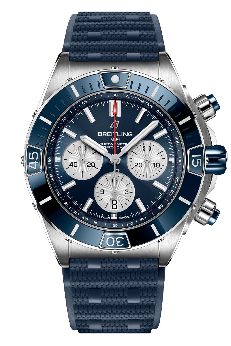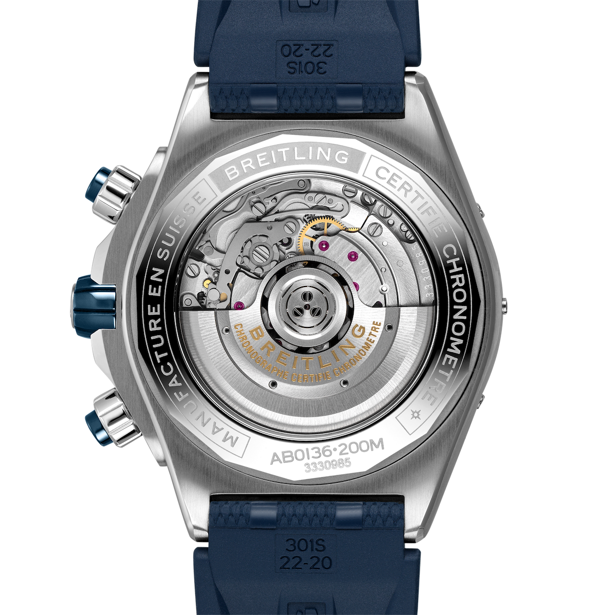 The Super Chronomat is water resistant to 200 meters, and is powered by the COSC-certified Breitling Manufacture Caliber 01, which provides about 70 hours of power reserve.