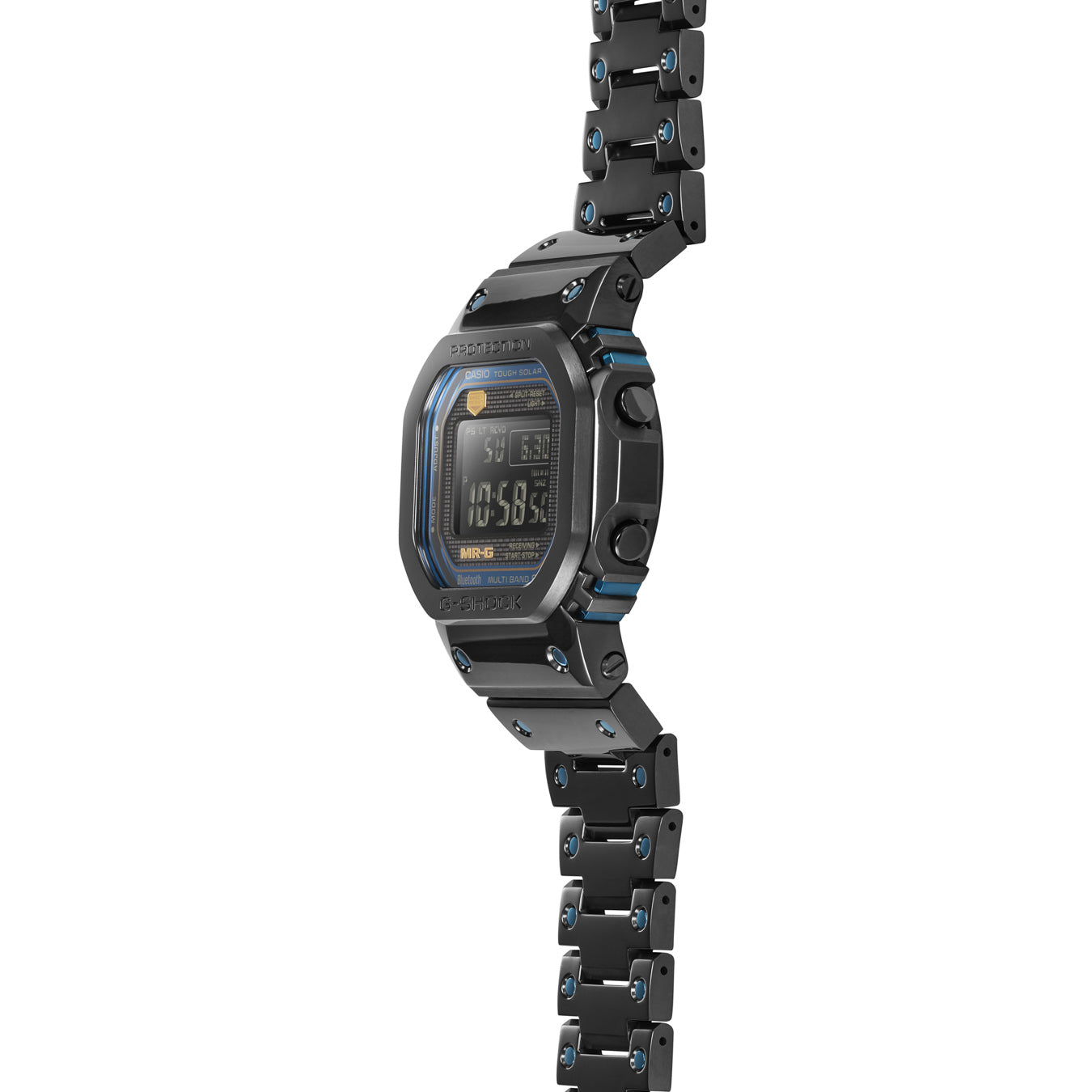 Uniting all the ultra-modern hallmarks and refinements deployed by MR-G with G-Shock's legendary square-cased design is the all-new MRG-B5000, a breakthrough reference representing also a study in metal craftsmanship. The case and bezel are made of Ti64-based super-hard titanium alloy, while the bracelet is made of another special titanium alloy, DAT55G, that is both three times harder than pure titanium and highly workable. The bezel top is crafted in Cobarion®, a cobalt-chrome alloy four times harder than pure titanium.