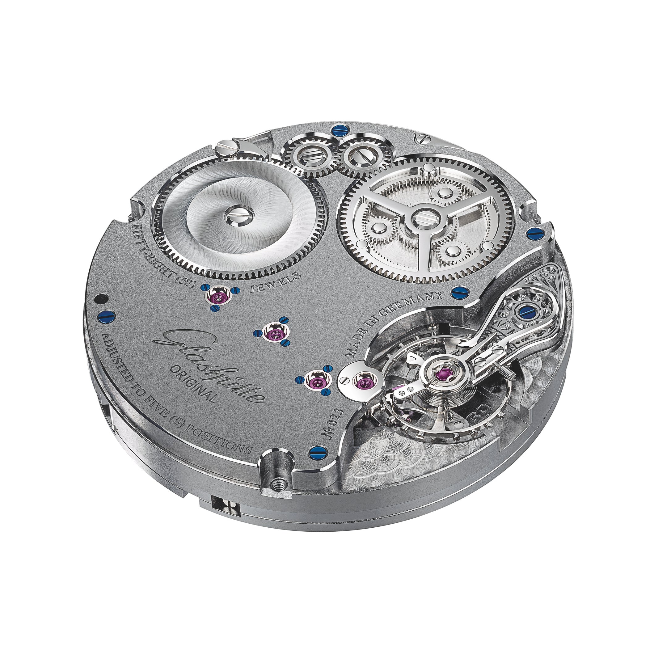 The manufactory calibre is equipped with a sophisticated second-stop mechanism: when then crown is pulled, the time display stops and the second’s hand is reset to zero and held in that position. When setting the time, the minute detent ensures that the minute hand jumps ahead from index to the next with an audible click – thus ensuring that the correct relationship between seconds and minutes is maintained. The calibre 58-08 is also a visual delight. Through the sapphire crystal case back, the finely finished features of the Glashütte art of watchmaking can easily be recognised: the characteristic three-quarter plate, screw-mounted gold chatons and the hand-engraved balance cock.