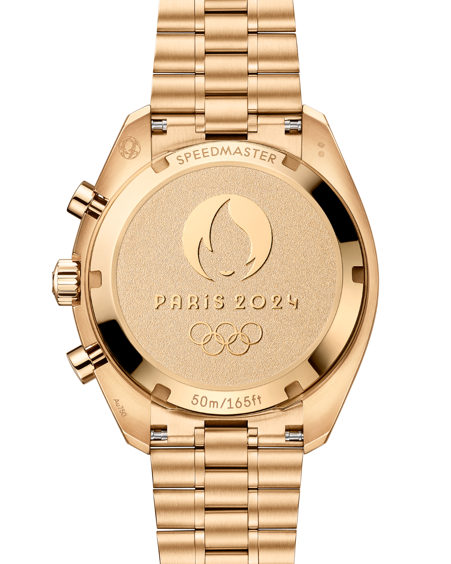 On the reverse side, the commemorative Moonshine Gold caseback reveals a stamped medallion with a frosted base, featuring a mirror-polished Paris 2024 logo, along with the stamped words, "Paris 2024" and the Olympic Rings.