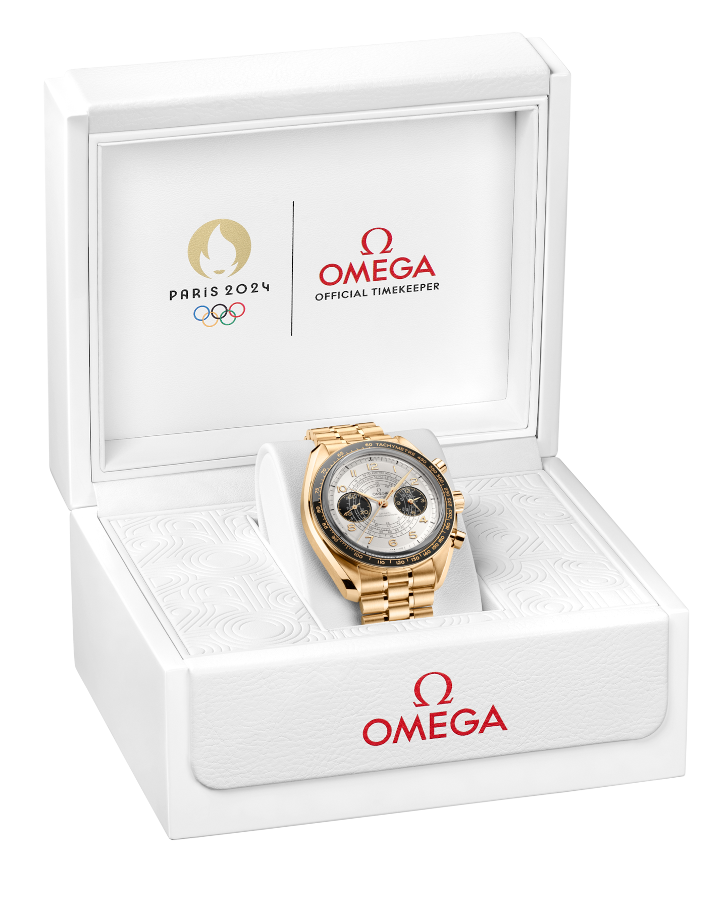 This 43 mm model is a tribute to the Olympic Games Paris 2024 and features the three main colors of the event, including gold, black and white. The timepiece is crafted in 18K Moonshine™ Gold with a silvery white opaline dial and blackened subdials. Additional features include a black ceramic bezel ring with tachymeter scale in OMEGA Ceragold™, Arabic numerals in 18K Moonshine™ Gold, and leaf-shaped hands and subdial hands that are PVD Moonshine™ Gold treated.