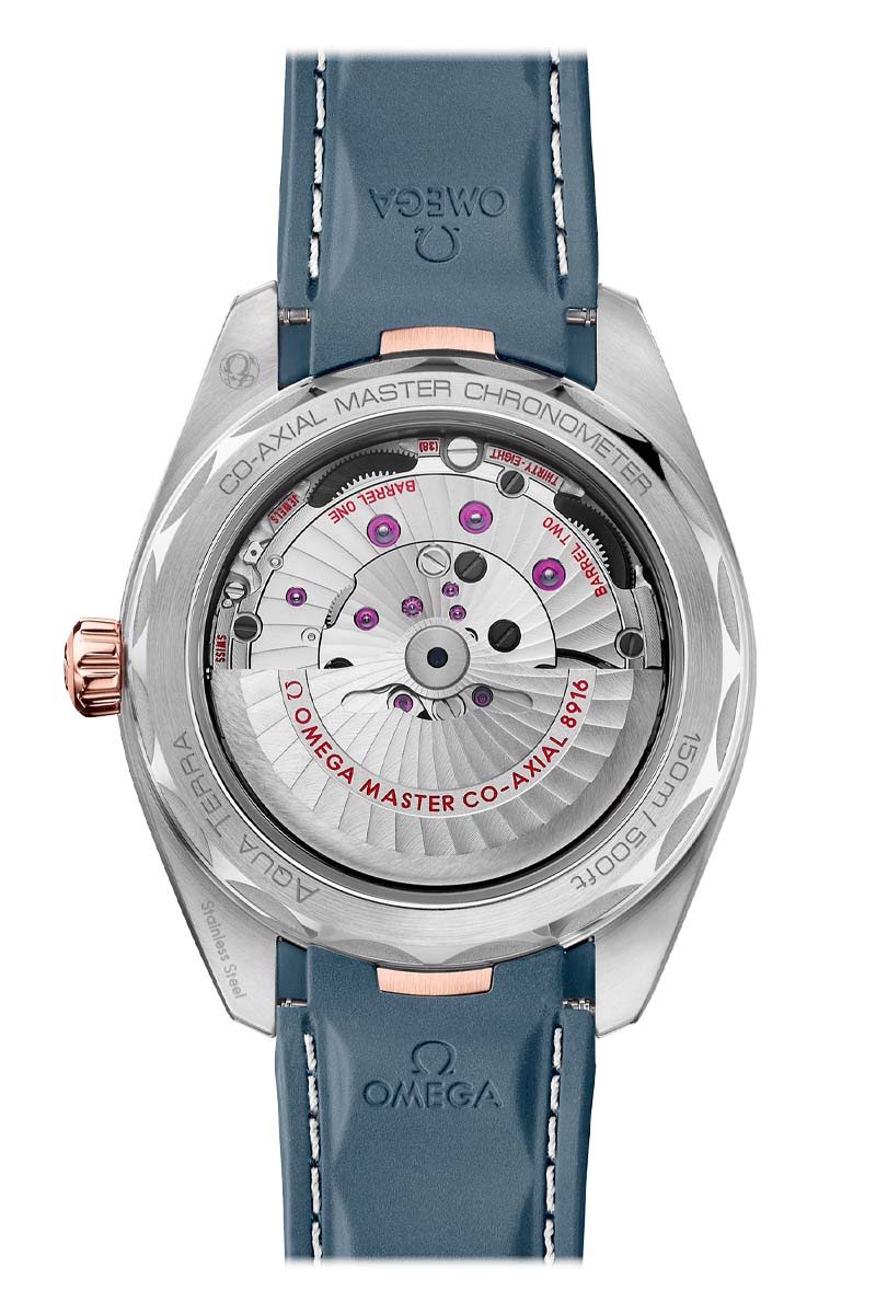 Presented on a structured blue rubber strap with grey stitching, this timepiece is powered by the OMEGA Co-Axial Master Chronometer calibre 8916, certified at the industry’s highest standard by the Swiss Federal Institute of Metrology (METAS).