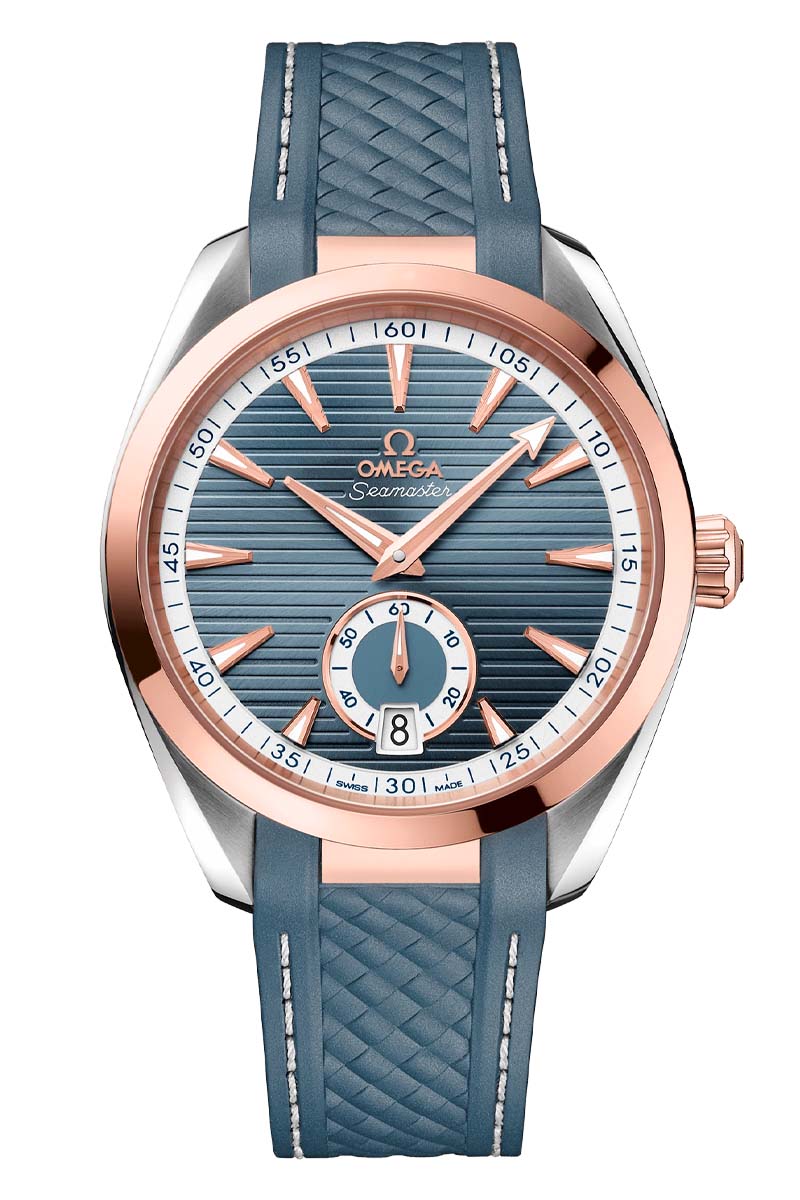 The sun-brushed blue-grey dial is distinguished by a horizontal “teak” pattern, along with a date window at 6H and an opaline Small Seconds subdial featuring an 18K Sedna™ gold ring. The design is further complemented by 18K Sedna™ gold hands and indexes filled with white Super-LumiNova, as well as sandblasted minutes and seconds tracks on the dial and subdial.