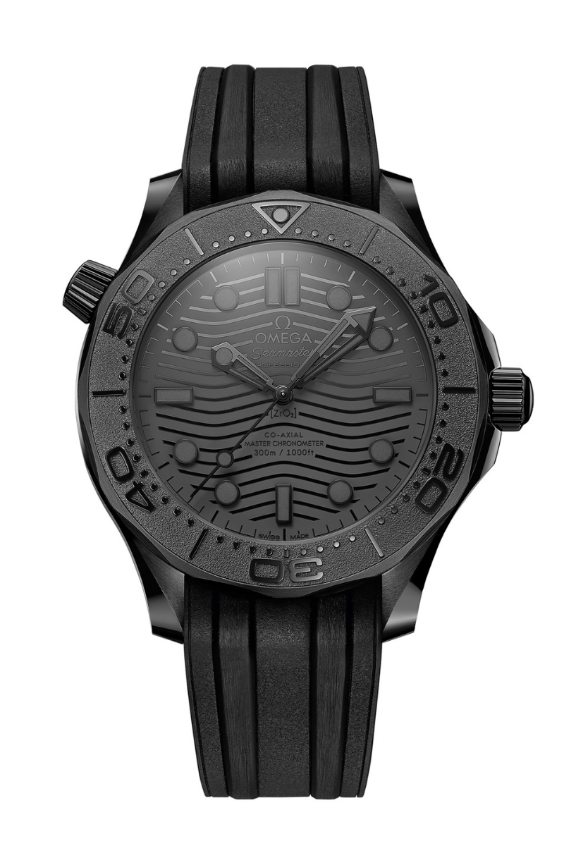 Since 1993, the Seamaster Professional Diver 300M has enjoyed a legendary following. OMEGA’s 21st century models stay true to the original’s dive watch design, while introducing exciting new materials and movements. On this 43.50 mm model, black ceramic [ZrO2] dominates. The case, bezel, wave-pattern dial, crown and helium escape valve, all in the same striking material, give the watch a very distinctive, uniform and sculptural look. To ensure visibility without affecting the overall aesthetic, OMEGA has introduced anthracite Super-LumiNova to the diving scale, the black PVD indexes and skeleton hands - and dot at 12H. Completing the look is an integrated black rubber strap with black ceramic buckle. Adding some light to the darkness is a window with a clear view of the movement. Visible through the sapphire-crystal on the wave-edged caseback is OMEGA’s Co-Axial Master Chronometer Calibre 8806.