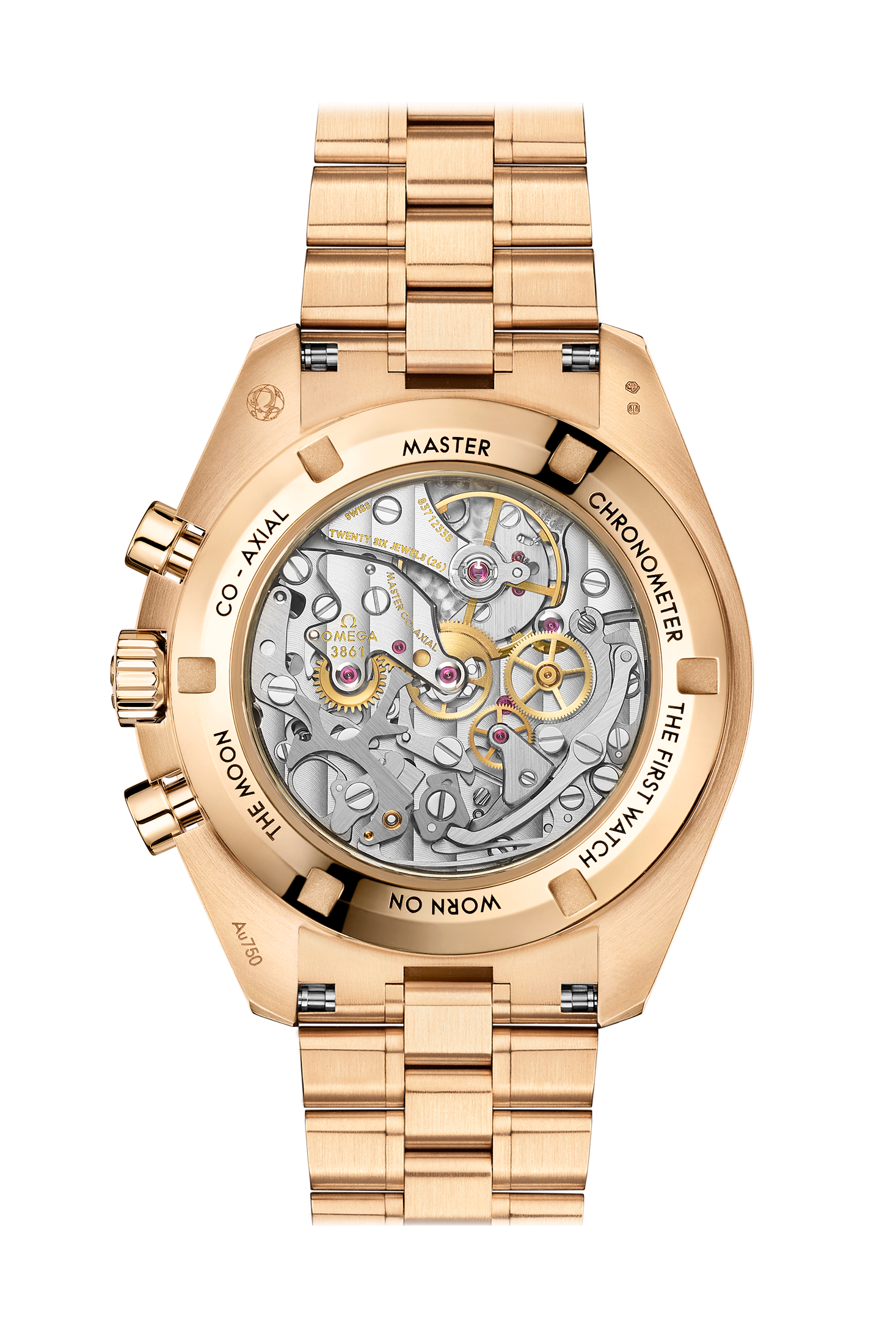 The caseback in polished 18K Moonshine™ Gold has double bevels and the words FIRST WATCH WORN ON THE MOON engraved in black. The Moonwatch is powered by OMEGA's Co-Axial Master Chronometer Calibre 3861 with special luxury finish.