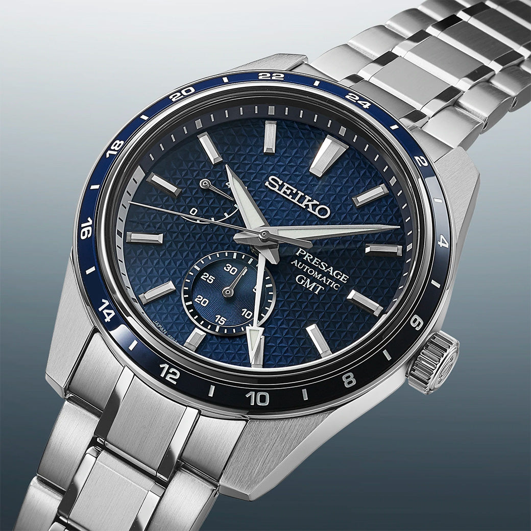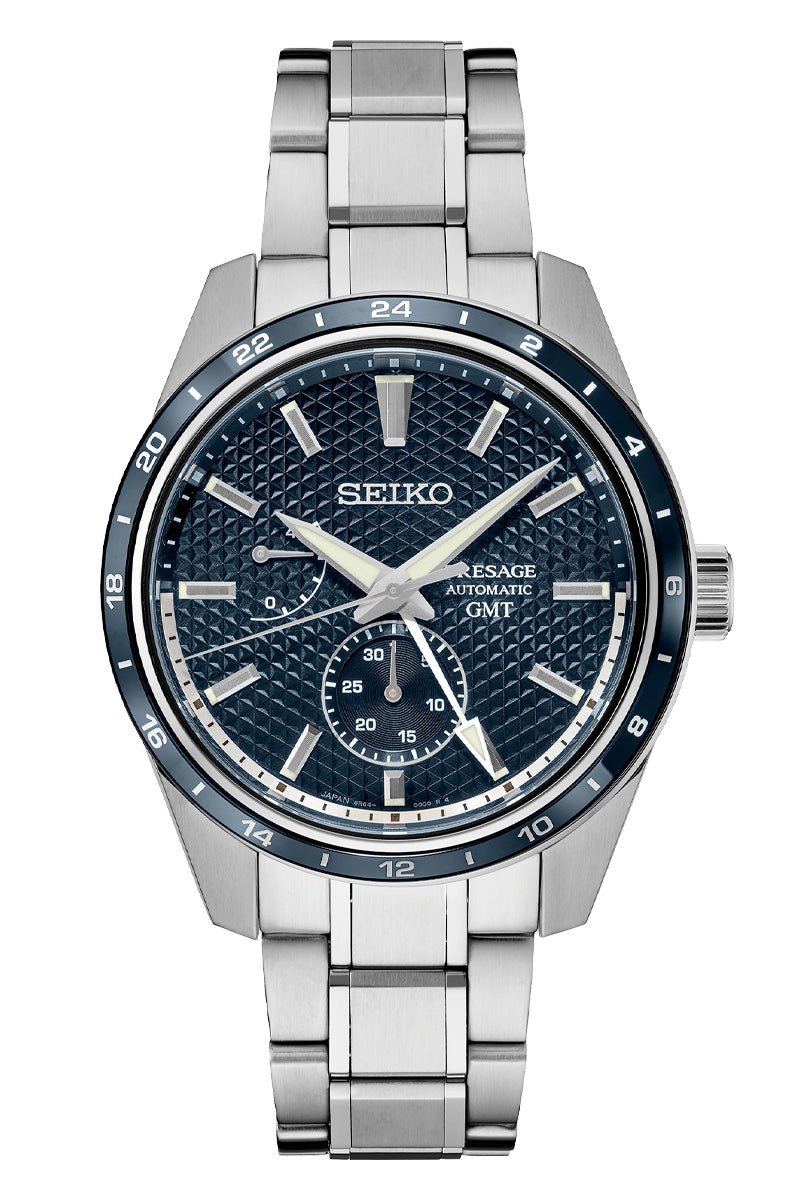 Offering the finest in Japanese mechanical watchmaking, the Presage Collection blends precision technology with superior craftsmanship and design. Joining the coolly angular Sharp-Edged Series, celebrating the fresh look of contemporary Japanese design, this exceptional Limited Edition is available only in a controlled production run of 900. The brilliant blue dial, enhanced by a gloss finish and inspired by the summer view of Mt. Fuji and the magnificent natural landscape of Japan, features the Presage Sharp-Edged Series' Asanoha hemp-leaf motif, a symbol of growth and prosperity dating to the Heian Period (794-1185 AD). Crafted of stainless steel with super-hard coating, this extraordinary watch offers a 29-jewel automatic movement, with GMT complication, that beats at a frequency of 28,800 vibrations per hour, with a power reserve of approximately 45 hours and manual winding capability. The dial, framed by a matching blue bezel, includes a 24-hour GMT hand, power reserve indicator, date display and LumiBrite hands and markers. A sapphire crystal features anti-reflective coating on the inner surface, while the tri-fold push button release clasp offers secure and comfortable wear. Packaged with an additional blue cordovan strap in a Limited Edition collectors' box. 10 bar, 100M Water Resistant.