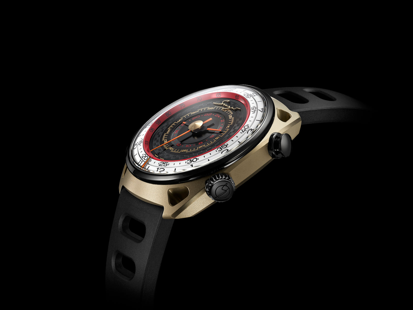 The watch’s lightweight titanium case is inspired by the use of titanium in the race car. The smooth golden ZRN coating of the case and the black details (bezel, winding crown and push buttons) complements the car’s livery.