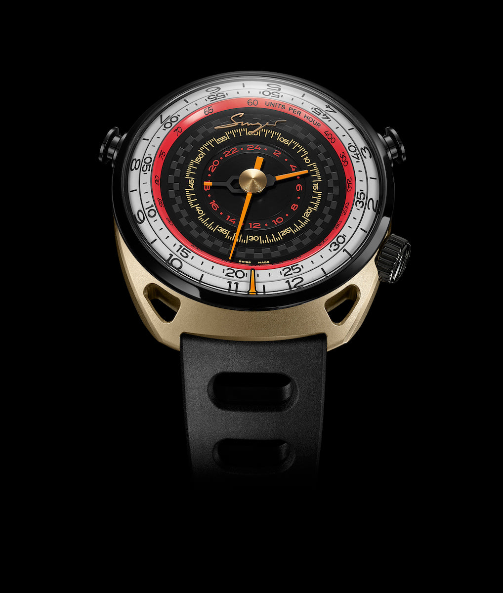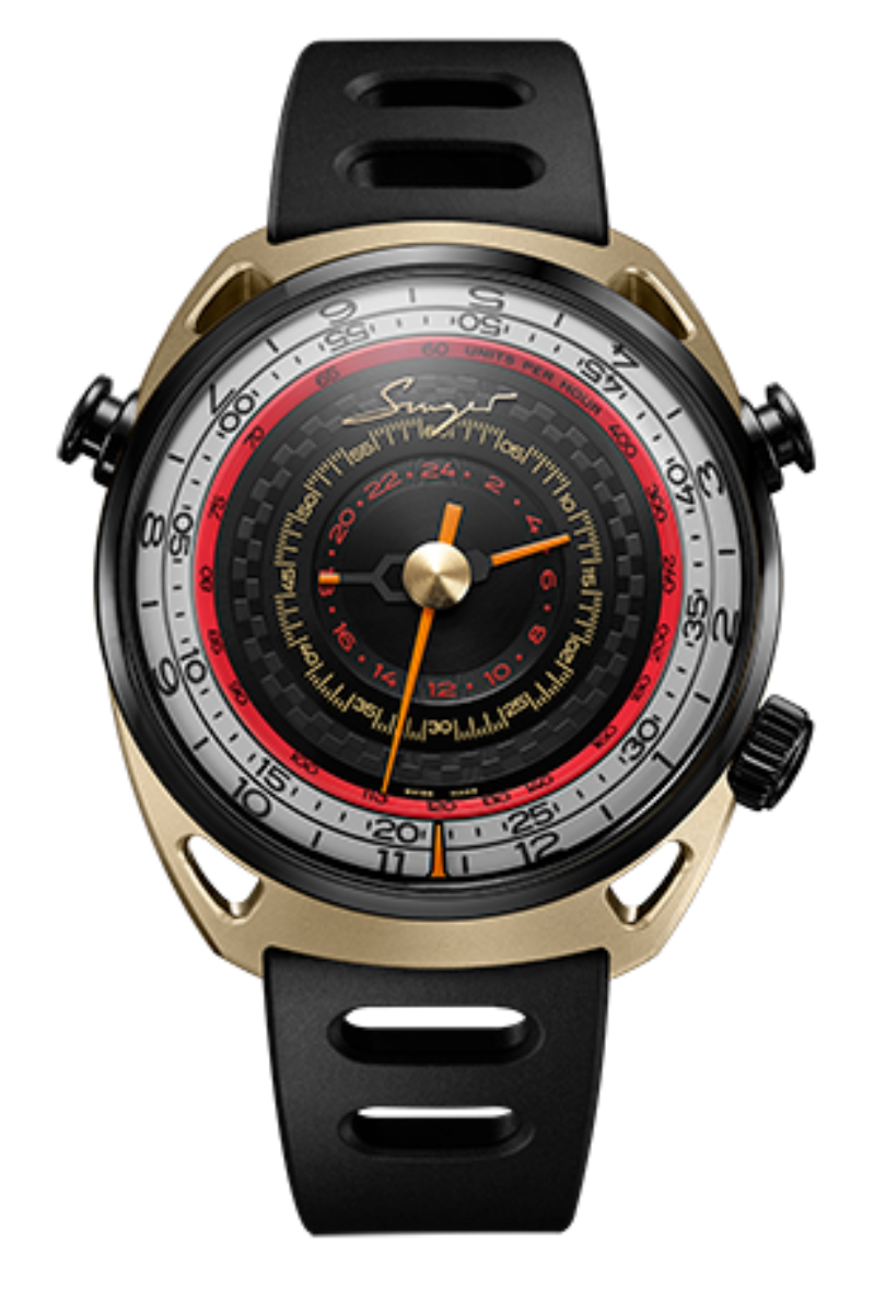 Time of day is shown by the constantly rotating ceramic discs in white, at the edge of the watch. The outermost disc marks the hours, while the inner discs indicated minutes past the hour. The two rotating discs are executed in Singer Racing White ceramic, yielding a world premiere.