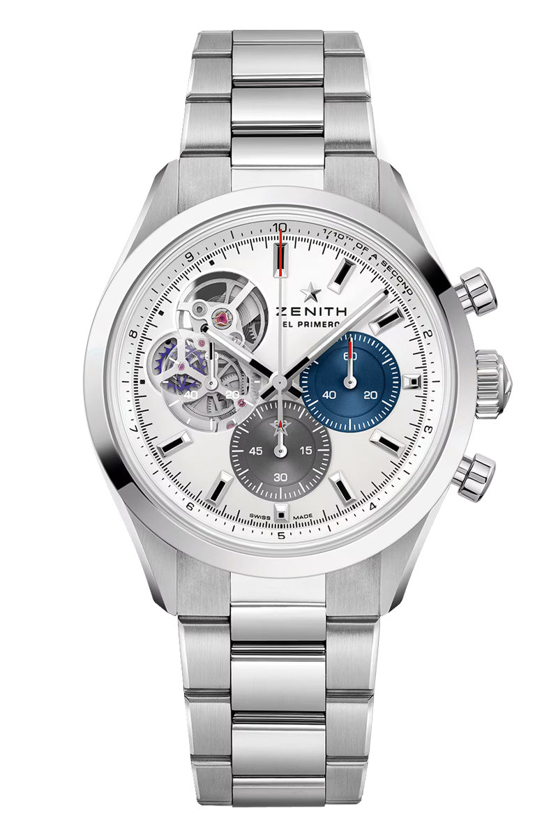 The Chronomaster Open offers a view of the beating heart of the El Primero movement from the dial. Crafted in a sleek 40mm steel case, this version features a matte silver dial with tricolour counters and a transparent counter for the running seconds, paired with an integrated steel bracelet. Powered by the El Primero 3604 1/10th of a second automatic chronograph movement.
