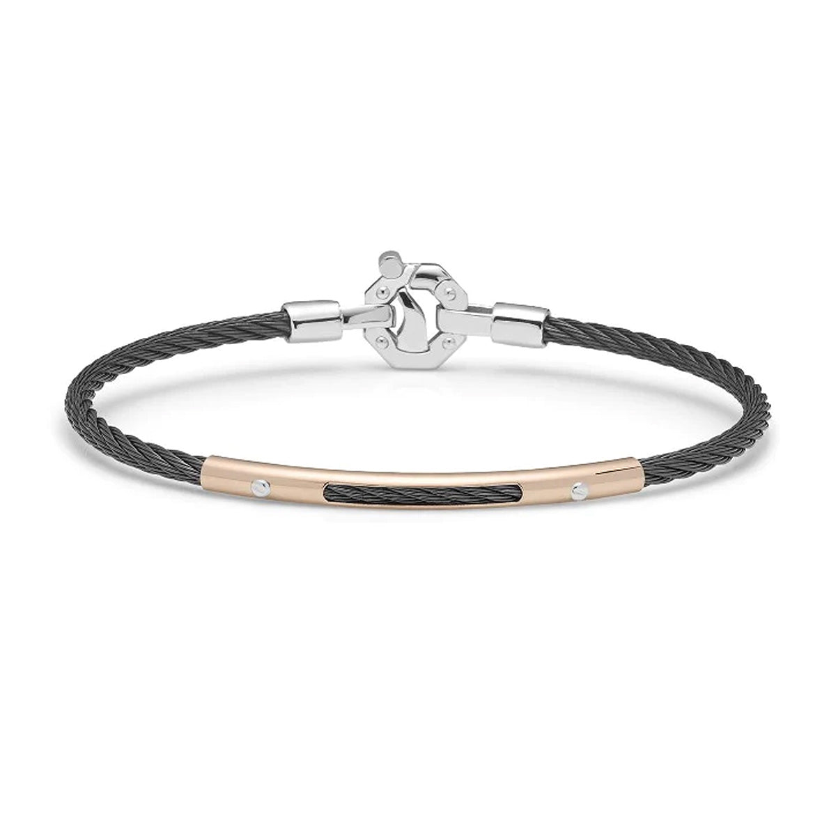 Stainless steel bracelet with black PVD and rose gold. White diamond in the clasp.