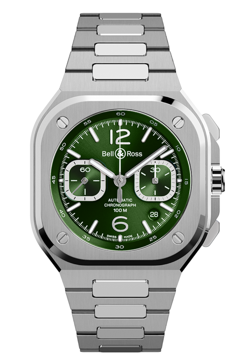 An essential tool for measuring short time intervals, the chronograph is the complication most commonly used in aviation. It is also the ultimate complication for sportsmen and those leading ultra-active lives. The calibre BR-CAL301 brings robustness, reliability and efficiency to the BR 05 Chrono Green Steel. Its rotor, which is visible through the sapphire case-back, is a complete, finely skeletonized rotor: a defining signature of Bell & Ross automatic movements.