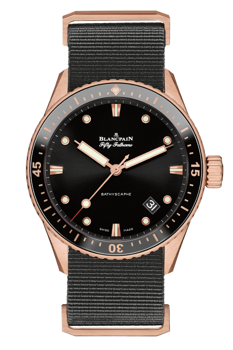 Take a journey back to the golden age of sport scuba diving with this modern Blancpain Fifty Fathoms Bathyscaphe, rendered in Sedna Gold, yielding a luxurious twist on a markedly capable tool watch.