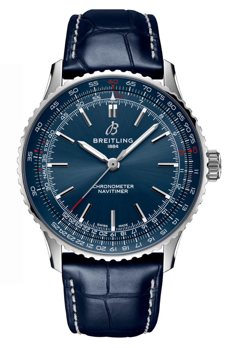 Refined and elegant, the Navitimer Automatic 41 combines the historic appeal of a true aviation icon with the sophistication and wearability of a contemporary timepiece. Its conservative, 41mm stainless steel case is fitted with a classic black dial, and pared with the Navitimer's signature bidirectional rotating beaded bezel. The Navitimer Automatic 41 is powered by the Breitling Caliber 17, a COSC-certified chronometer.