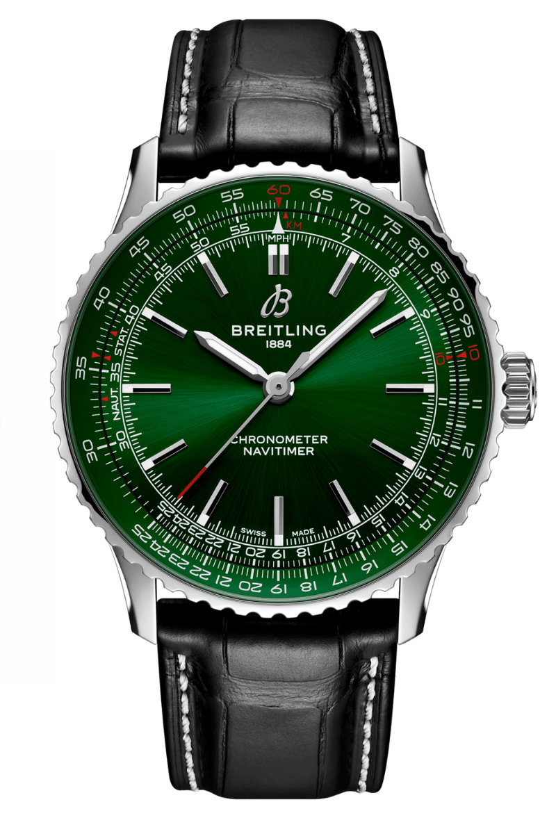 Refined and elegant, the Navitimer Automatic 41 combines the historic appeal of a true aviation icon with the sophistication and wearability of a contemporary timepiece. Its conservative, 41mm stainless steel case is fitted with a classic black dial, and pared with the Navitimer's signature bidirectional rotating beaded bezel. The Navitimer Automatic 41 is powered by the Breitling Caliber 17, a COSC-certified chronometer.