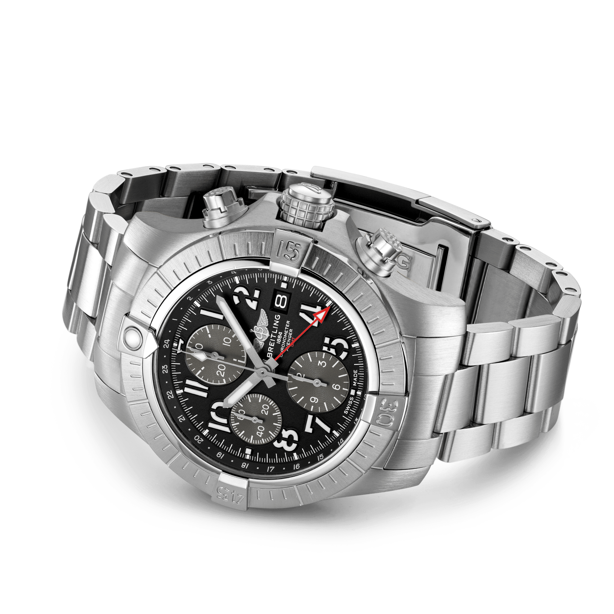 Bold, extremely robust and shock resistant, the Avenger Chronograph GMT 45 combines precision with a powerful design. As a true Breitling Avenger, it offers unrivalled safety and reliability to any airborne adventurer. The Avenger Chronograph GMT 45 features a sturdy 45mm stainless-steel case, black dial and a choice of a stainless-steel bracelet or matching military leather strap. Thanks to its rugged bezel and its special grip-pattern on the crown and chronograph pushers, the Avenger Chronograph GMT 45 can be easily operated wearing gloves.