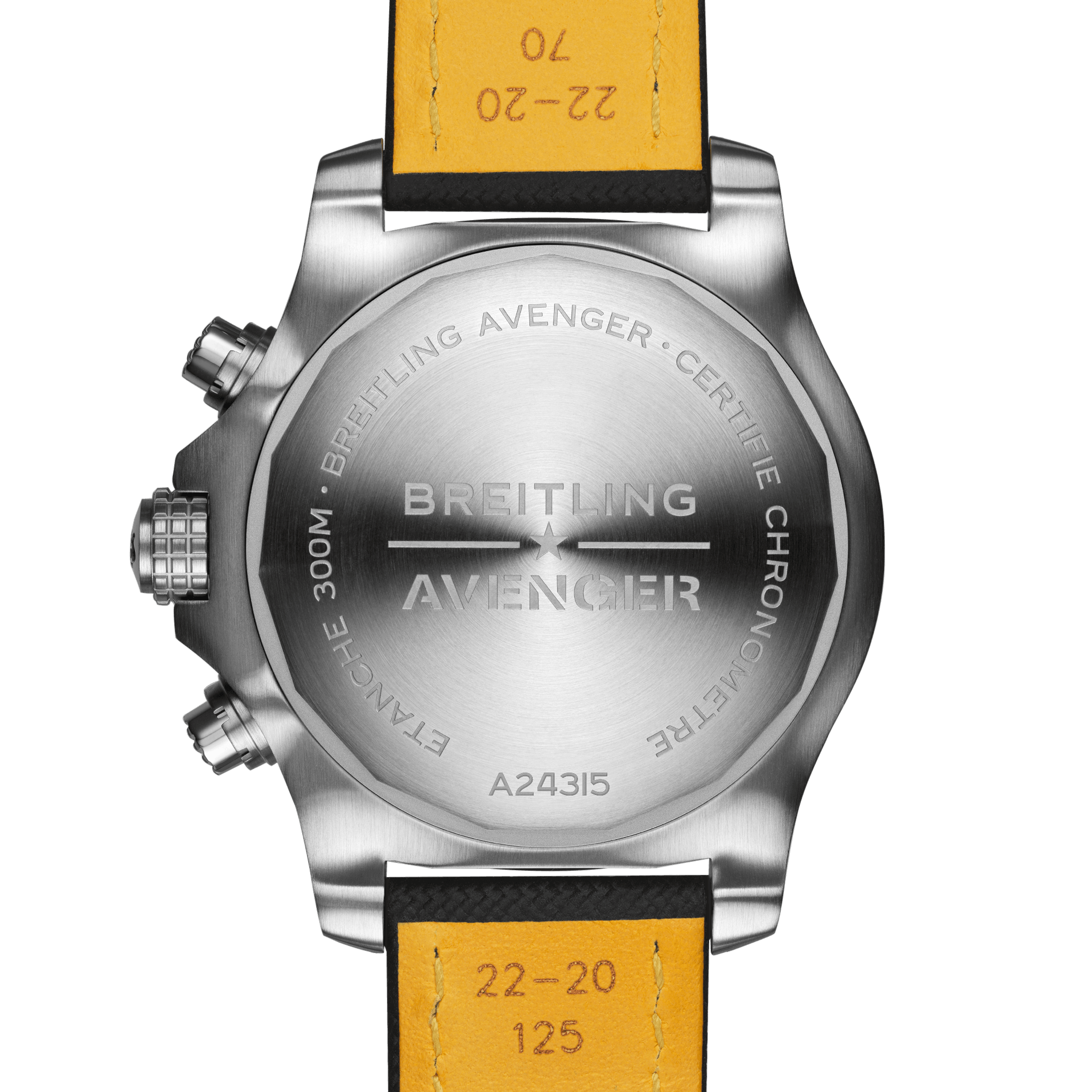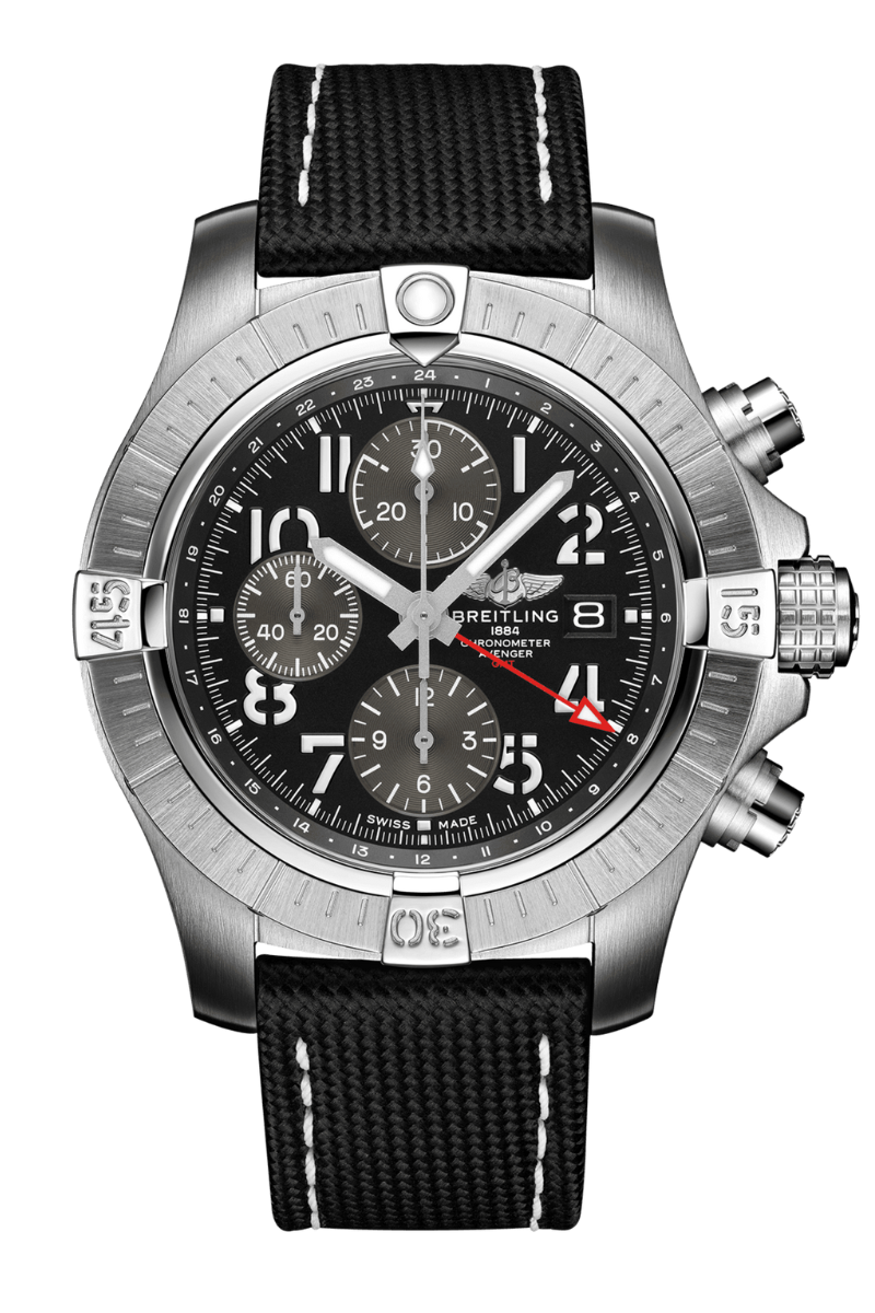 Bold, extremely robust and shock resistant, the Avenger Chronograph GMT 45 combines precision with a powerful design. As a true Breitling Avenger, it offers unrivalled safety and reliability to any airborne adventurer. The Avenger Chronograph GMT 45 features a sturdy 45mm stainless-steel case, black dial and a choice of a stainless-steel bracelet or matching military leather strap. Thanks to its rugged bezel and its special grip-pattern on the crown and chronograph pushers, the Avenger Chronograph GMT 45 can be easily operated wearing gloves.