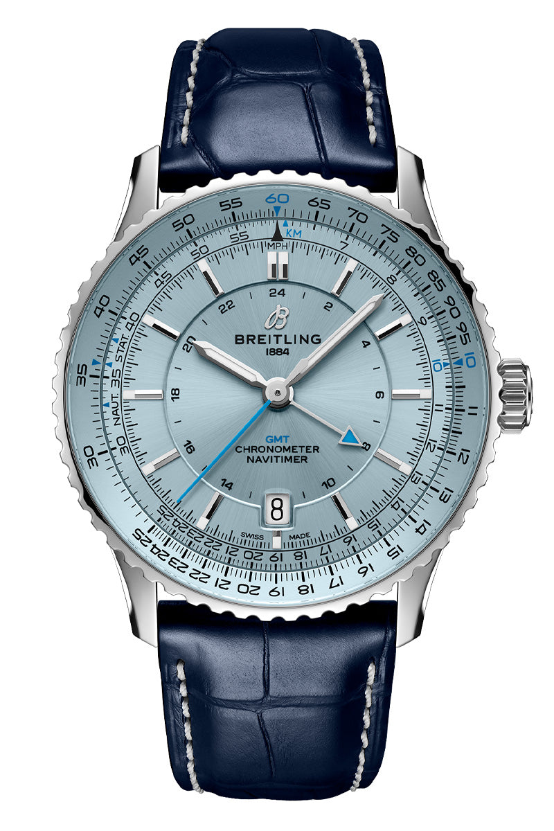 Originally conceived as a multi-function pilot's instrument, the Breitling Navitimer is one of the most recognizable watches ever made. This legacy continues with the Navitimer GMT 41 — a new reference that expands upon the collection's utility with the added ability to display a second time zone in 24-hour format. The central placement of this 24-hour scale on the GMT's dial ensures the intricacies of the slide rule stand out while still streamlining the overall aesthetics. Further refining the collection, the notched rotating bezel was incorporated for a modern, contemporary touch, and alternating polished and brushed finishes add a dynamic play of light.