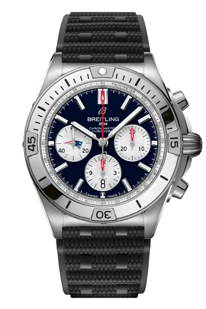 Powered by Breitling's in-house manufactured B01 chronograph calibre, this new 42mm Chronomat New England Patriots Edition watch honors the Pats with team colors captured in its navy dial with white subdials. The subdial at 9 o’clock celebrates this team with the classic New England Patriots logo.