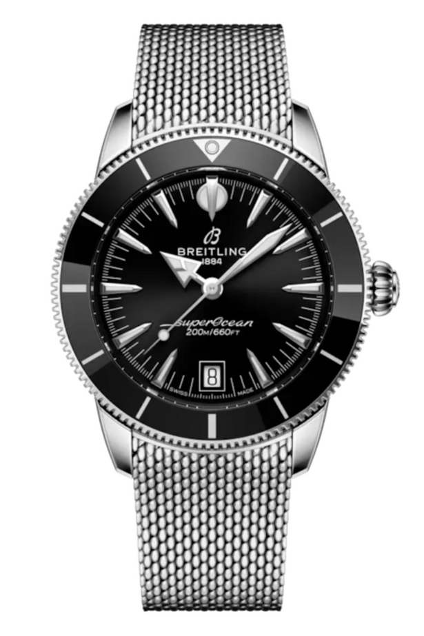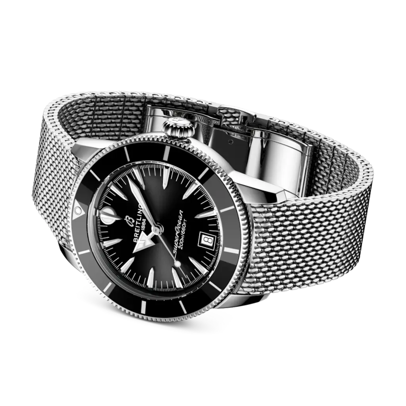 Today, that philosophy is still at the core of the Superocean Heritage, which retains the modernity and engineering demanded by a high-performance sports watch, without forsaking the soul of the 1950s. The latest Superocean Heritage builds on everything that made the original distinctive — and sharpens it. Powered by Breitling's exclusive B31 automatic movement, the watch is finished with a ceramic-inlayed bezel for exceptional scratch resistance, and an integrated mesh or mesh-style rubber strap fits snugly against the case, secured with a polished folding clasp for a clean, watertight finish. A discreet date window at six o’clock and the original signature hands — arrow for hours, spear for minutes — ensure legibility and balance, above or between the waves.