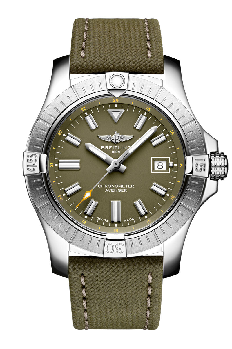 Bold, extremely robust and shock resistant, this online-exclusive Breitling Avenger Automatic 43 features a clean military-inspired olive green dial offering optimal contrast and legibility. And thanks to its rugged bezel and its special grip-pattern on the crown, the Avenger Automatic 43 can be easily operated wearing gloves.