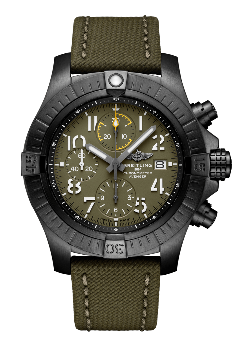 Bold, extremely robust and shock resistant, the Avenger Chronograph 45 Night Mission combines precision with a powerful design in a lightweight case. As a true Breitling Avenger, it can be used wearing gloves and offers unrivalled safety and reliability to any airborne adventurer. The Night Mission interpretation of the Avenger Chronograph 45 features a sturdy 45mm DLC-coated titanium case with a khaki green dial and a color-matched khaki military leather strap that fits a DLC-coated stainless steel deployant clasp. Its specific Arabic numerals recall the stenciled numbers used on the decks of aircraft carriers. Thanks to its rugged bezel and its special grip-pattern on the crown & chronograph pushers, the Avenger Chronograph 45 Night Mission can be easily operated wearing gloves.