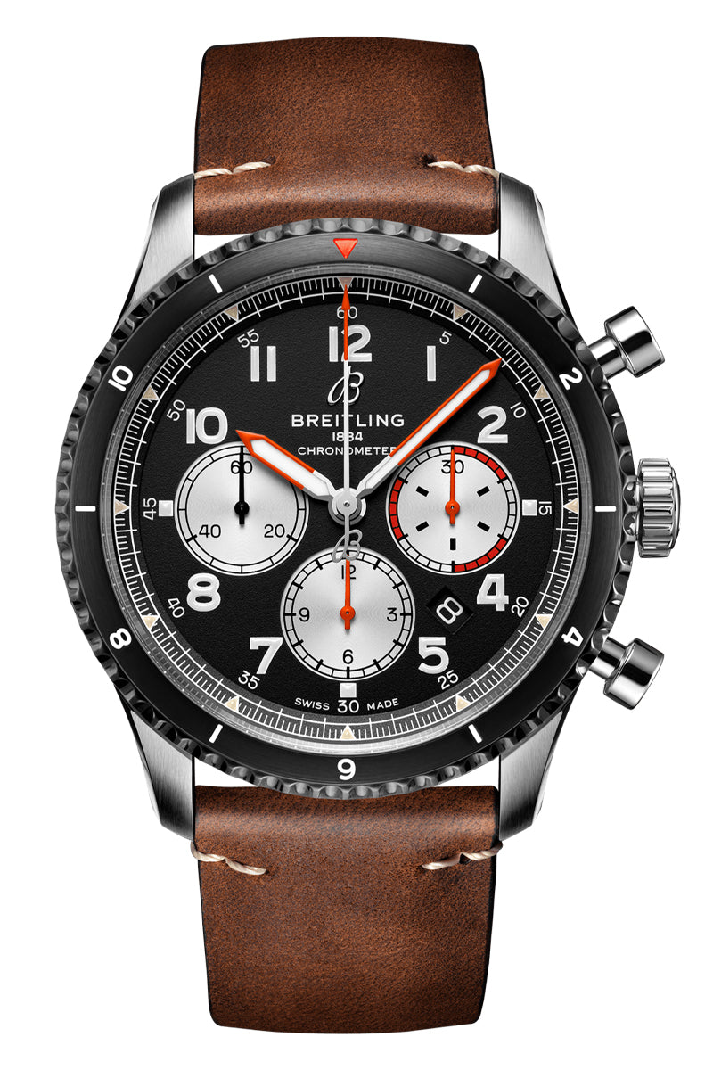 The Aviator 8 B01 Chronograph 43 Mosquito honors the De Havilland Mosquito, a British aircraft whose lightweight wooden construction made it one of the fastest planes in the skies during World War II. Mostly made of wood, the De Havilland Mosquito was a British aircraft that served in a variety of roles. Built between 1940 and 1950, the so-called “Wooden Wonder” was one of the fastest planes in the world – in fact, thanks to the wooden construction, it flew 20 mph faster than the famous Spitfire, which was equipped with the same engine. The Aviator 8 B01 Chronograph 43 Mosquito is powered by the in-house Breitling Manufacture Caliber 01 movement and features a brushed DLC-coated stainless-steel bezel with white numerals and a black dial with contrasting silver chronograph counters. The eye-catching red and orange accents recall the military roundels and markings featured on the fuselage of the De Havilland Mosquito and add to the watch’s allure. The De Havilland Mosquito played a key role in the history of aviation and Breitling is proud to commemorate a true legend of flight with the Aviator 8 B01 Chronograph 43 Mosquito.