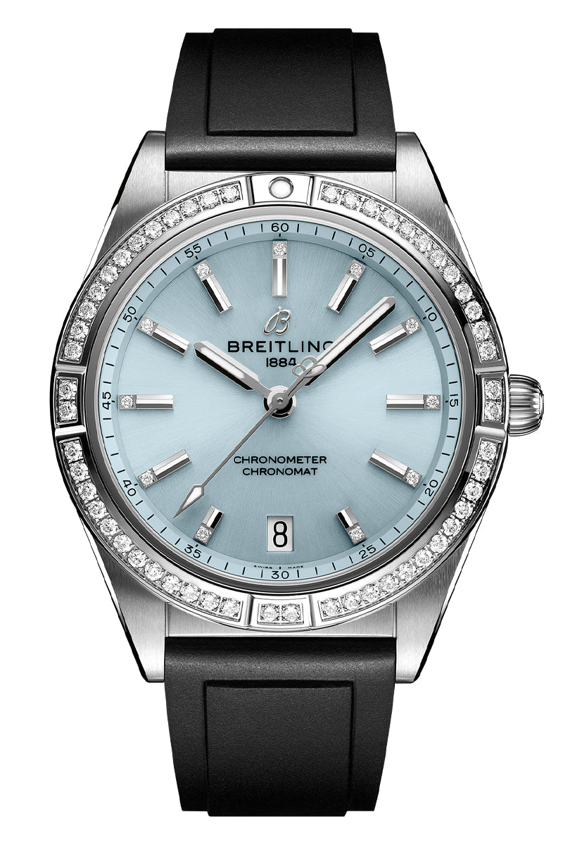 Starting with a versatile stainless steel case, this sporty-chic Chronomat in 36mm is punctuated with a factory gem-set gold bezel with 54 0.72 CT round diamonds, perfectly accenting the new Ice Blue dial, and tailored for those who crave a little extra sparkle in their lives. Available on a rubber strap with stainless steel folding buckle, this Chronomat is powered by the Breitling Caliber 10, a COSC-certified chronometer.