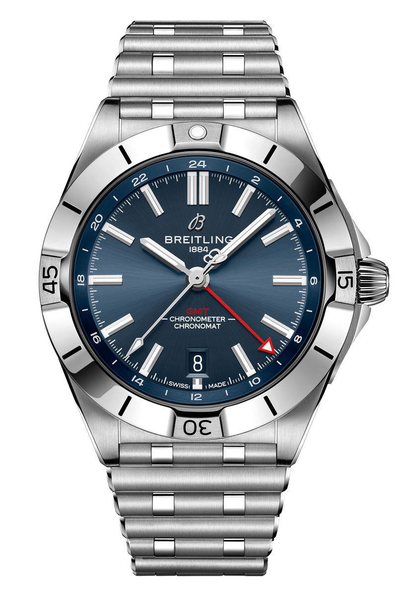 This new evolution of the legendary Chronomat marks the icon's next evolution. Powered by a special GMT movement and presented in stainless steel, the Chronomat GMT is built around a new 40mm case reinforced with uniquely shaped crown guards, and featuring Breitling's classic bezel with the four rider tabs and the brand's newly engineered 'Rouleaux', or bullet bracelet — a much-loved badge of the high-flying Chronomat, now tailored for the modern globetrotter.