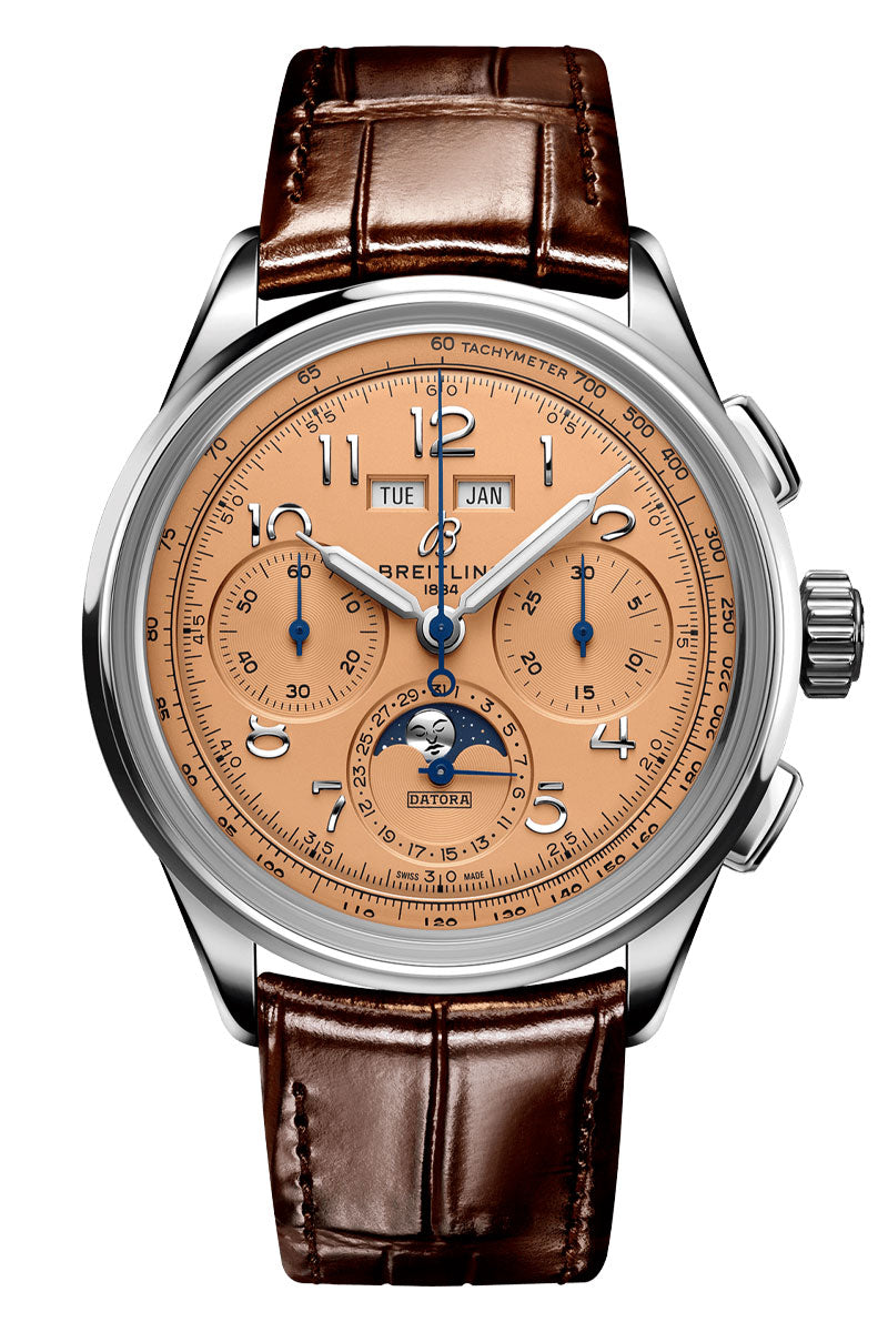 Featuring rectangular chronograph pushers and Arabic numerals, the heritage-revived Premier Datora displays a variety of elegant design details such as grooves on the case-sides, open sapphire casebacks and vintage-inspired hands. The Datora comes in two variations: in stainless steel with a copper dial and a brown alligator strap or in 18k red gold with a silver dial and a brown alligator strap. “Datora” was a term used by Breitling in the 1940s and refers to a complete calendar chronograph displaying day, date, month and the different moon phases. The Datora is powered by the cosc-certified Manufacture Caliber B25.