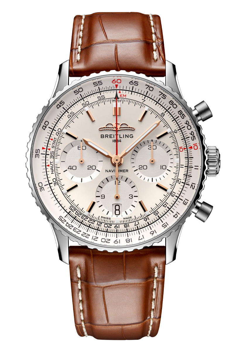 To create the new Navitimer, Breitling preserved the most recognizable aspects of the icon's design code. From a distance, this is unmistakably a Navitimer, with its circular slide rule, baton indexes, trio of chronograph counters and notched bezel for easy grip. Up close, however, its modern refinements come through loud and clear.