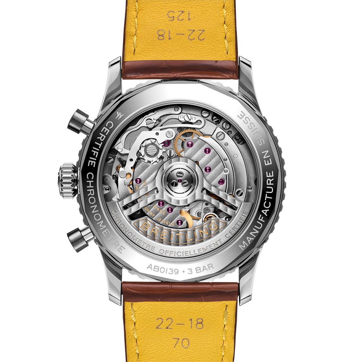 A flattened slide rule and a domed crystal create the illusion of a more compact profile. Alternating polished and brushed finishings give the metal elements a lustrous, yet understated quality. A slimmer silhouette on the oscillating weight enhances the open-caseback view of the COSC-certified Breitling Manufacture Caliber 01. This movement is backed by a five-year warranty, provides approximately 70 hours of power reserve and allows the wearer to change the date—now visible through a discreet window in the subdial—at any time.