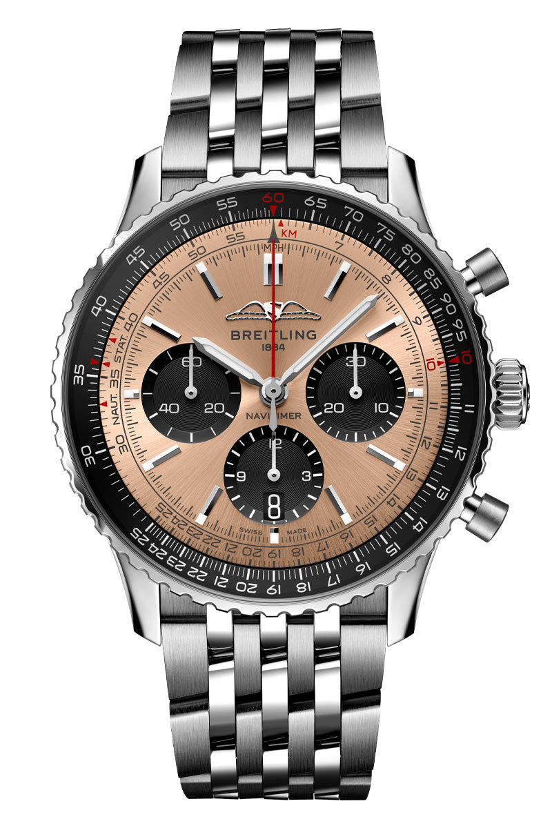 To create the new Navitimer, Breitling preserved the most recognizable aspects of the icon's design code. From a distance, this is unmistakably a Navitimer, with its circular slide rule, baton indexes, trio of chronograph counters and notched bezel for easy grip. Up close, however, its modern refinements come through loud and clear.