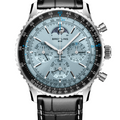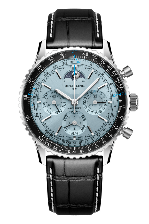 For Breitling's 140th anniversary, the Grenchen maker introduced the Caliber B19 — its first exclusive perpetual calendar chronograph movement. The milestone achievement now powers this special-edition Navitimer, a watch with its own legendary history. First created in 1952 for the Aircraft Owners and Pilots Association (AOPA), the Navitimer was designed for precision in the cockpit, combining a chronograph with Breitling’s patented circular slide rule. Pilots swore by its flight-computer functionality, but its appeal soon extended beyond aviation — to star athletes, musicians, and even astronauts. In 1962, it became the first Swiss wristwatch in space. This edition bridges past and future: a steel case, platinum bezel, ice-blue dial, and the remarkable B19 movement—an automatic chronograph with a perpetual calendar. A watch built from heritage, made for today.