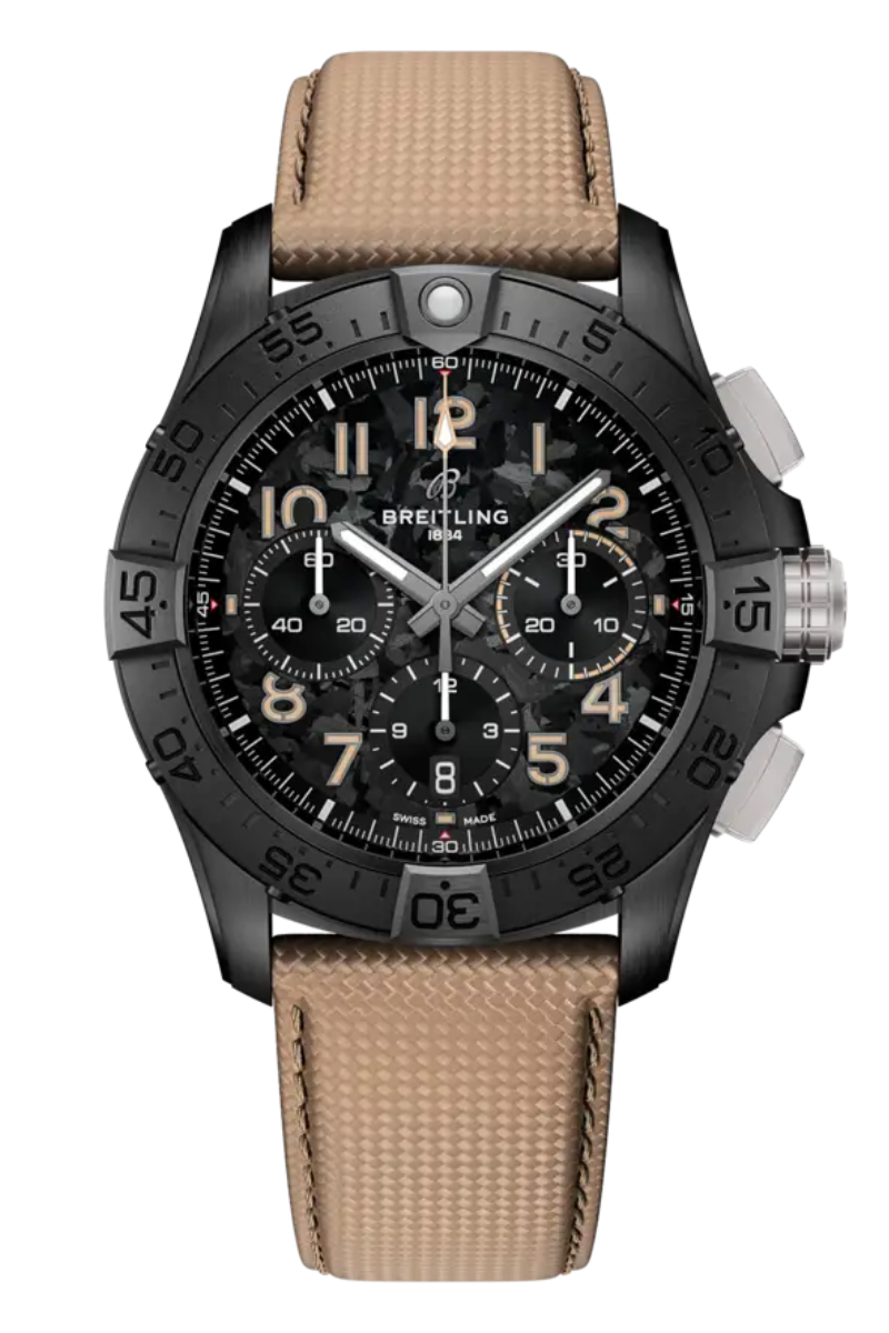 Built for daring jet pilots, this stealthy black ceramic Avenger is designed to take on the toughest cockpit environments and keep coming back for more. But you don’t need air force credentials to appreciate its bold design, exceptional resilience, and next-level functionality. Pairing high performance with sophisticated modern style, purposeful aviation-inspired design elements, and dial selections drawn from military uniform shades, the modern Breitling Avenger is the most rugged cockpit instrument the legendary Grenchen manufacturer produces, and it shows in spades. And whether you can handle the g-force or not, you'll still fully appreciate the Avenger’s robust 300 meters of water resistance, its newly engineered 42mm case, tactile rotating bezel, and corrosion-resistant construction — all of which make it perfectly tailored for any adventure from right here on earth all the way up at the edges of the stratosphere.