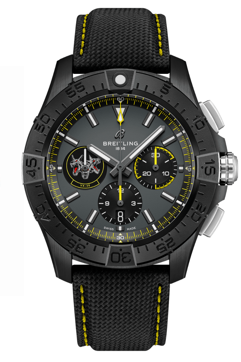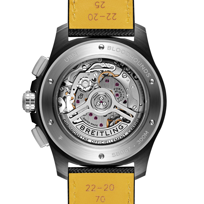 Built for jet pilots, the Avenger is designed to take on the toughest cockpits and keep coming back for more. This special edition is dedicated to the high-flying pilots of the U.S. Navy’s elite Bloodhounds Air Test Squadron, but you don’t need Air Force credentials to appreciate its bold design, exceptional resilience, and next-level functionality. This execution features the unit’s emblem and striking grey and yellow color scheme, along with a dedicated engraving surrounding the open caseback view of the Breitling manufacture caliber 01.