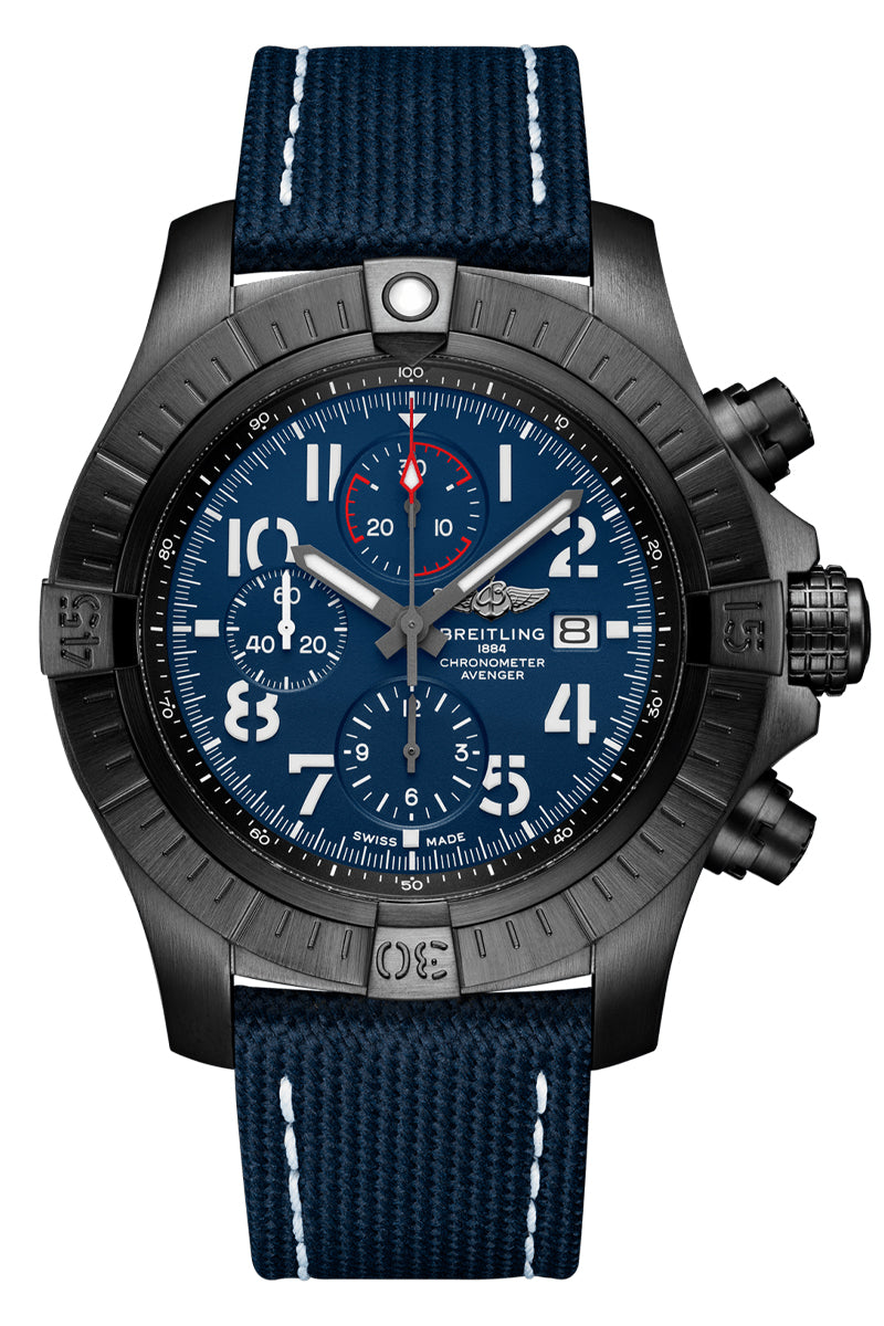 Bold, extremely robust and shock resistant, the Super Avenger Chronograph 48 is the ultimate Breitling Avenger adventure reference. The Super Avenger Chronograph 48 features an oversized, but lightweight and stealthy DLC-coated 48mm titanium case fitted with Breitling's "Night Mission" blue dial. And thanks to its rugged bezel and its special grip-pattern on the crown & chronograph pushers, the Super Avenger can be easily operated while wearing gloves.